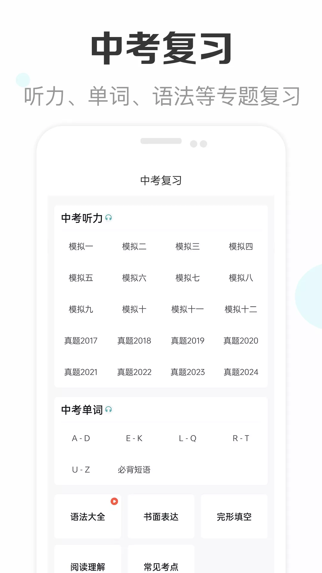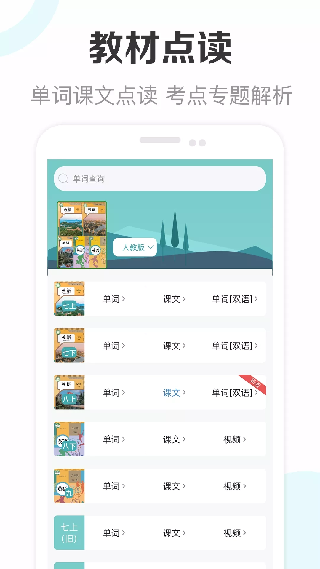 初中英语教材智能点读,中考专题复习。 【教材点读】新课标初中七到九年级的单词和课文(同步翻译),高清原声配音,可跟读、可点读。 【单元总结】对单元知识点进行归纳总结,学习更有方法。 【听力练习】初中听力练习,由简到难,逐步提升听力水平。 【初中语法】初中阶段语法大全,讲练结合,语法全掌握。 【中考复习】听力、单词、书面表达、完形填空、阅读理解等各项专题复习。 【其他科目】语文+历史。课文原文听着背。 【其他功能】复读机功能、单词听写、单词发音校准、朗读语速调节、夜间护眼模式等,让你学习更舒适。 APP备案编号:湘ICP备19023207号-9A