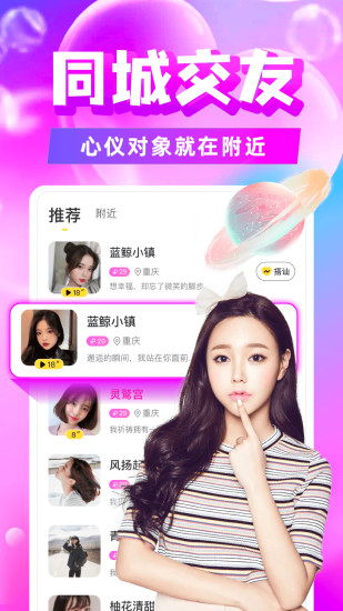 "附近妹子主动邀你聊! 【真人交友】海量单身异性,一键筛选自由选择,找你喜欢的聊。 【视频交友】附近陌生人聊天,1V1视频聊聊,美女主动打招呼,聊天快回复,随时开心畅聊。 【附近推荐】只能推荐附近人,开始与近距离的ta的浪漫邂逅!让陌生人不在陌生。 【同城爱聊】同城素人美女正在直播,角色扮演,才艺展示,陪你度过每一个无聊的夜晚! 【动态广场】记录日常,分享点滴,关心了解她的生活,变成让她心动的人!"
