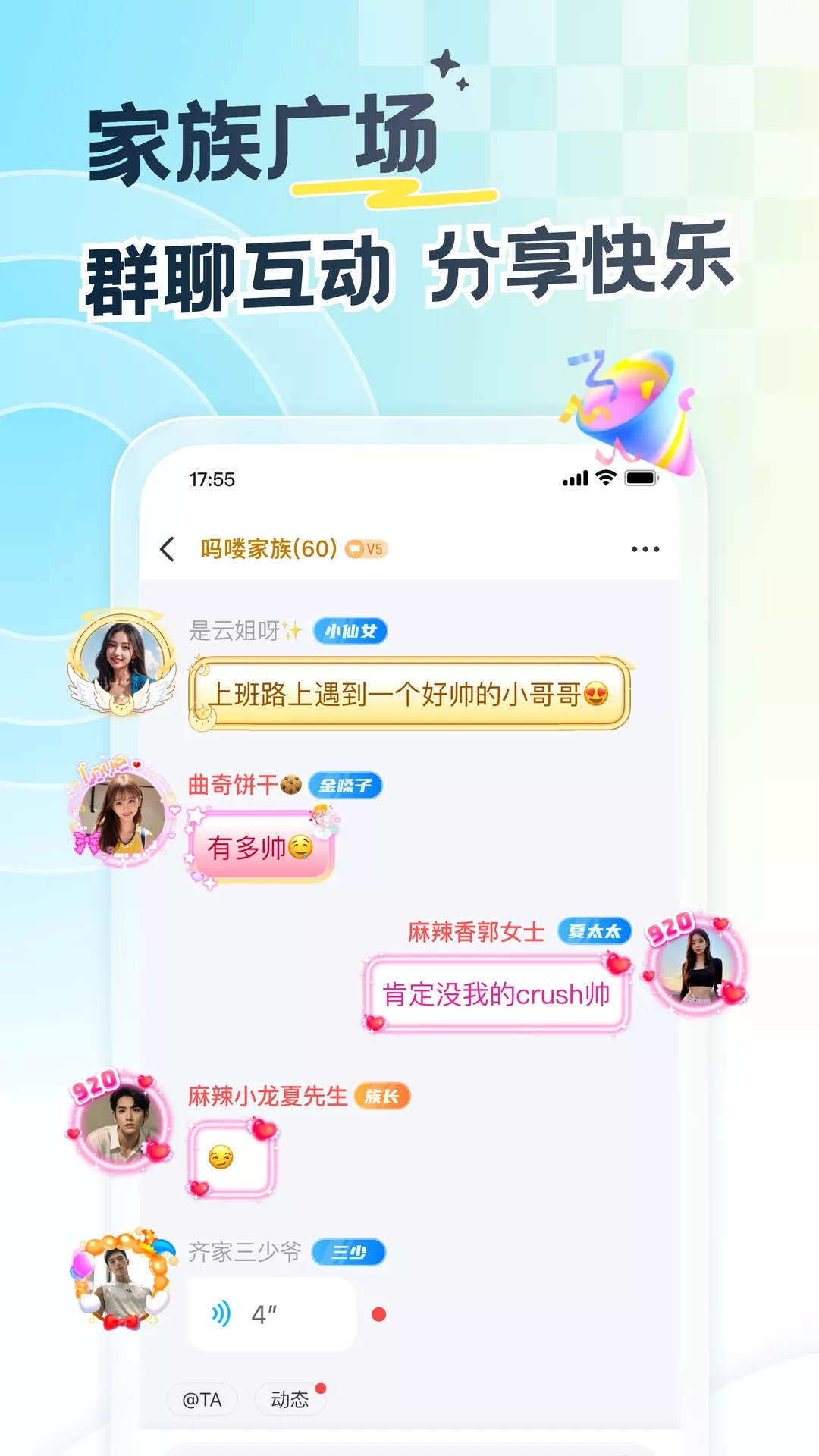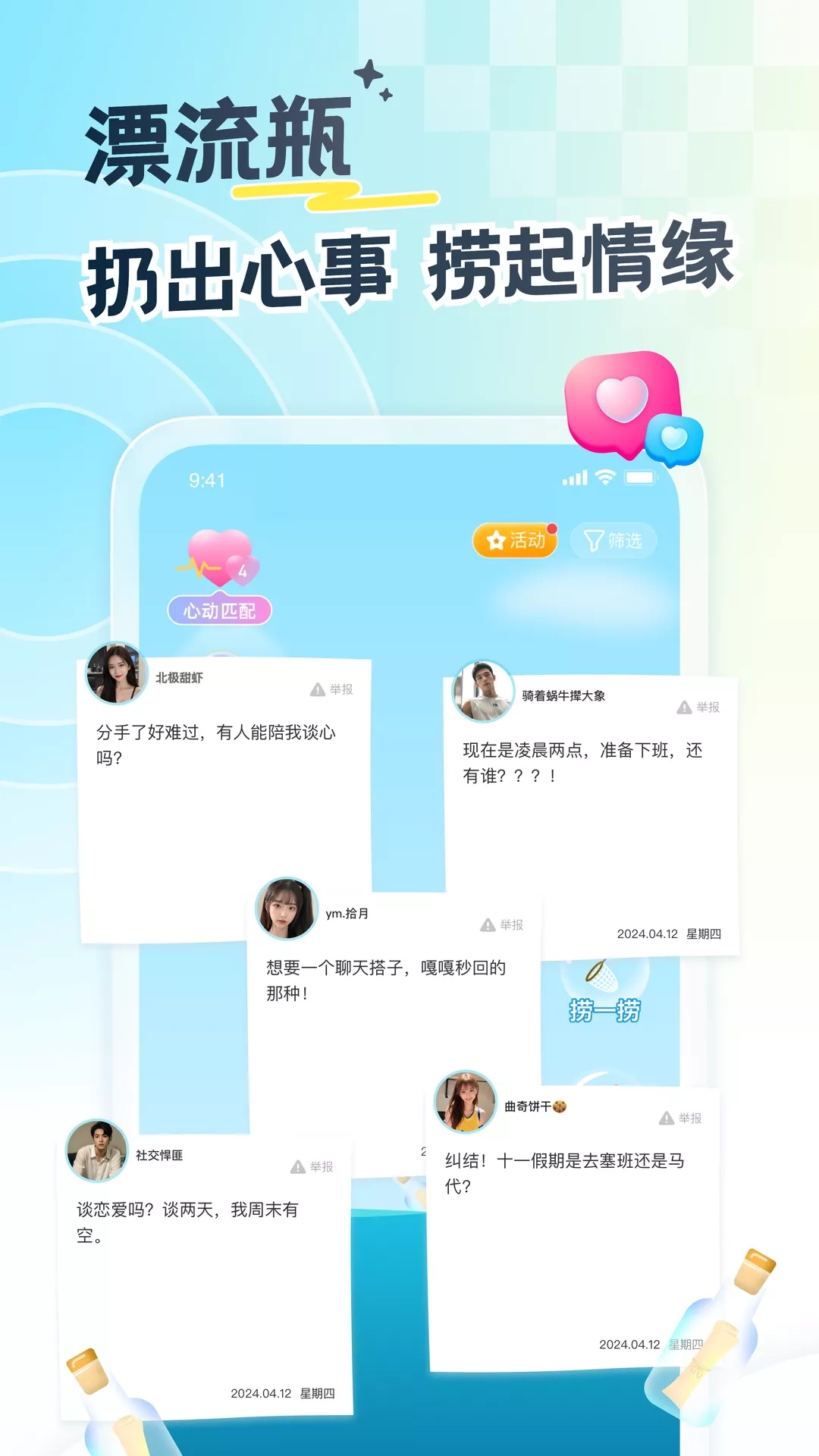 一款万千小哥哥小姐姐免费在线嗨聊的交友平台,多元社交玩法帮你发现有趣的圈子,遇见好听的声音,找到同频的Ta,一起分享生活的点滴,开启不一样的交友之旅! 功能介绍: 漂流瓶:心事扔进大海,捞起心动情缘 心动匹配:海量小哥哥/小姐姐极速配对,语音畅聊 家族群聊:加入自己的兴趣圈子,与家族好友群聊互动,分享快乐 动态广场:随心讨论热门话题,随时分享生活趣事 语音派对:聊天唱歌,才艺比拼,多人在线,语音嗨聊 亲密关系、画猜接歌等更多功能等你来揭秘! 遇见是一切的开始,因为遇见,所以美好 --------------------- 我们渴望听到你的反馈,如果你有任何问题或建议,欢迎使用应用内的“意见反馈”功能直接告诉我们。