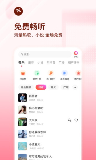 【抖音旗下】抖音推出的官方免费音频产品,内容超全。 【免费畅听】海量热歌、小说、相声评书全场免费,你想听的全都有。 【超多福利】超多红包,见面有礼,听歌听书福利,天天畅享福利拿不停,随时随地提现到账。 【超全分类】抖音热歌、经典老歌、广场舞、华语流行、DJ、轻音乐、儿歌,各种品类应有尽有。 【随心K歌】 流行经典,想唱就唱。