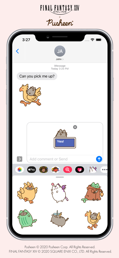 Make your conversations cuter with these adorable FINAL FANTASY XIV x Pusheen animated stickers! Includes 20 animated stickers: • Pusheen riding a Chocobo • Cactuar costume Pusheen • Pusheen in an Airship • Bard Pusheen • Black Mage Pusheen plotting • Carbuncle Pusheen • Pusheen in a pile of gil • Dragoon Pusheen • Pusheen with “help” potion • Dark Knight Pusheen • Chocobo costume Pusheen • Nervous Pusheen tries to ignore meteor • Moogle Pusheen • Ninja Pusheen • Pusheen saying “No.” • Pusheen saying “Yes!” • Pusheen and Moogle hugging • Sleeping Red Mage Pusheen • Tonberry costume Pusheen • White Mage Pusheen WHERE TO FIND THE STICKERS AFTER INSTALLING: Step 1: Open a message with a friend and tap the "A" icon to the left of the text box. Step 2: Tap the Moogle Pusheen icon and start sending stickers! TIP: If you can’t find the icon in step 2, scroll right in your app bar until you see the “…” icon and then tap it to bring up a full list of your iMessage apps. You will be able to select the Moogle Pusheen icon from that menu. FINAL FANTASY XIV © 2010-2020 SQUARE ENIX CO., LTD. All Rights Reserved. © 2010-2020 Pusheen Corp. All Rights Reserved.