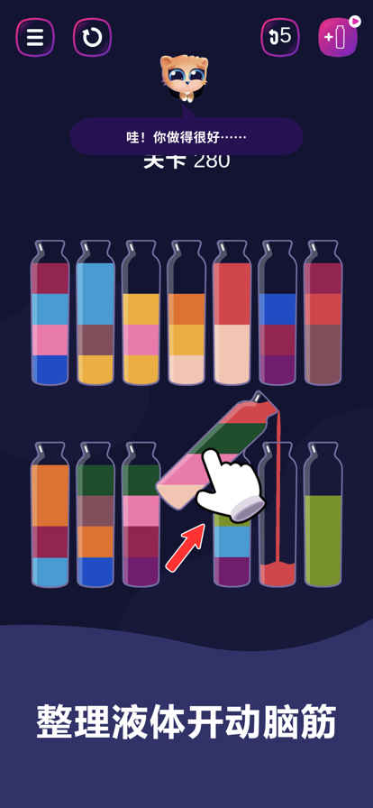 轻松解压的颜色分类游戏,考验你的逻辑思维,超有趣超解压,强迫症患者福音! 【游戏玩法】 点击选择一支试管,将其中的颜料倒入另一支试管内。当每支试管都被相同颜色的颜料装满时即可通关。 需要注意的是:只有顶层颜料的颜色相同并且试管有内有足够的容量时才能将颜料倒入试管 【游戏特点】 画风清新简约,玩法益智解压 操作简单,随时随地,想玩就玩 众多关卡,游戏难度逐渐增大 快来成为最强大脑吧!