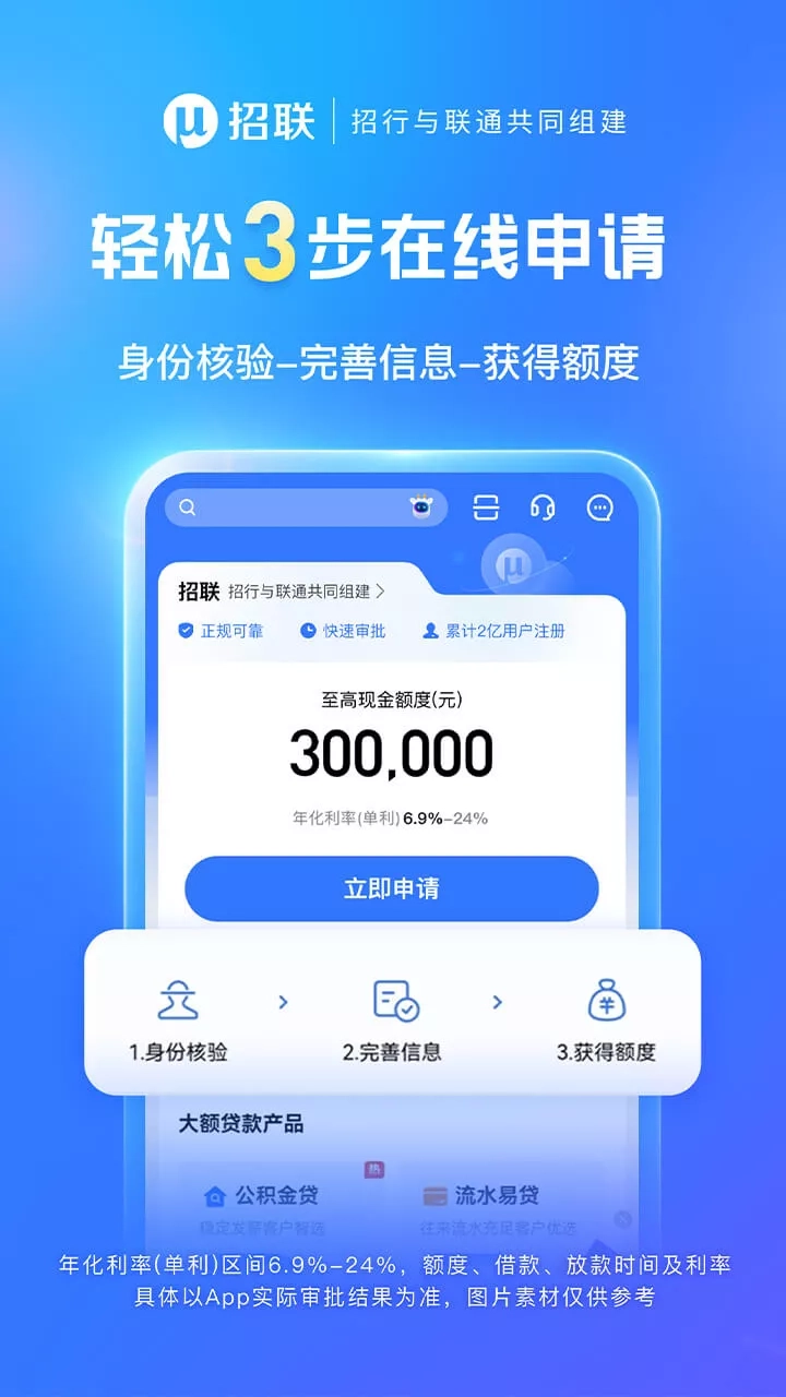 招联金融:凭身份证等材料在线申请!借款成功后最快1分钟放款!额度最高30万元! 利率高低、额度高低、还款时间都能“商量”,解锁更多「智惠」金融服务! 【平台介绍】 招联金融:由招商银行与中国联通共同组建,持牌消费金融机构。为您提供安全、专业、智能、便捷的现金借贷、分期消费贷款服务。 【产品优势】 1、申请易:线上申请,无抵押 2、速度快:快速放款,现金借款成功后最快1分钟到账 3、额度高:可借金额最高30万元 【产品简介】 ● 现金借贷:招联为您提供专业的消费贷款服务。 ● 分期购物:使用招联金融信用额度,自由选择分期数,先消费、后还款。 ● 展示内容:汇聚更多精彩,「惠」无止境,一「下」就来! 【联系我们】 微信关注“招联金融”官方公众号,为您提供快捷便利服务! 官方网站:www.mucfc.com 【风险提示】 ● 具体页面内容与活动规则以实际页面展示为准 ● 贷款额度、利率、放款时间以实际审批结果为准 ● 招联金融贷款仅可用于消费;请根据个人能力合理贷款,理性消费,避免逾期