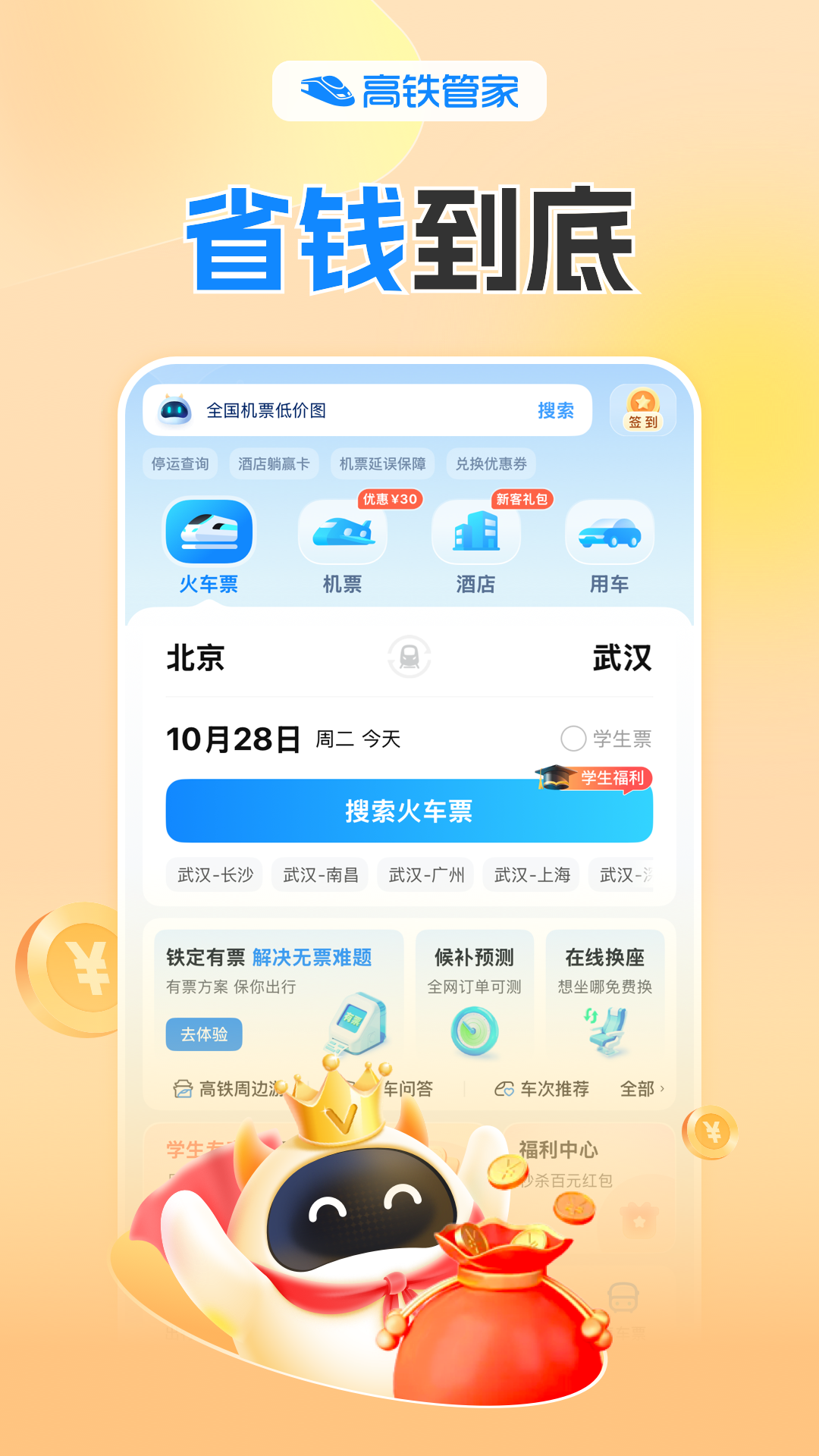 智行火车票-火车票、机票、酒店、汽车票、门票、船票一站式出行预订平台。<br>出行神器,提供火车开售时间、正晚点、候补人数查询等一站式出行服务,功能全面助您旅途顺心!<br><br>主要产品与服务:<br><br>【火车票】<br> [线上选座] - 在线选择心仪座位,下铺、靠窗随心选。<br> [免费车票] - 积分兑车票,0元免费坐火车。<br> [自动抢票] - 可提前预约下单,开售时自动秒杀出票;不仅抢候补,也能抢余票。<br> [24小时抢] - 可全天24小时抢票,有专人帮抢,成功率高,抢不到就敢赔。<br> [抢票福利] - 靠窗、下铺免费抢,学生还有全年免费抢票福利,抢不到免费升坐席。<br> [余票捡漏] - 各条线路隐藏余票一键检索,免费监控,即刻解决无票难题。<br><br>【特价机票】<br>买机票,先来智行比价,全球低价尽在智行。<br><br>【低价酒店】<br>低价监控,有房监控,平台还可以帮您跟商家还价,低价不错过。