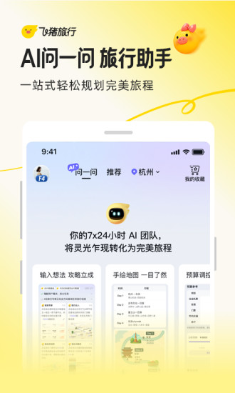 飞猪旅行是阿里巴巴集团旗下旅行品牌,提供机票、酒店、火车票、汽车票、景点门票、用车、周末游、跟团游、自由行、自驾游、邮轮、旅游度假产品任您选!精选攻略、出行保险,旨在为您提供优惠、便捷、高性价比的出行服务。 飞猪App供国内及海外众多酒店,民宿,客栈,酒店式公寓在线预订服务;提供多条国内及出境旅游线路,并提供电话卡,境外Wi-Fi,租车,签证等一站式服务;全覆盖国内外多主流景点门票,在线预订一键预约;提供国内所有航线和国际航班主流航班机票,国内所有火车票的在线订购。 【特色服务和精彩活动】 1.「旅行助手」飞猪全新推出AI“问一问”,可随时随地为您挑选有性价比的机票、酒店和目的地,提供更准确、更有温度、可即时预订的旅行方案,帮您省去用多个App查询信息、拼凑攻略、反复比价的麻烦,它好比一支7*24小时在线的AI旅行定制团队,帮您轻松规划完美旅程。 2.「全球代言人」重磅官宣!虞书欣正式成为飞猪旅行全球代言人!这一次,虞书欣将与你分享她的旅行灵感,让我们一起跟着她的脚步,开启心动旅行吧! 舒心出行,就上飞猪旅行。 3.「新人礼包」首次下载飞猪旅行,即享百元机票、酒店、火车票大礼包