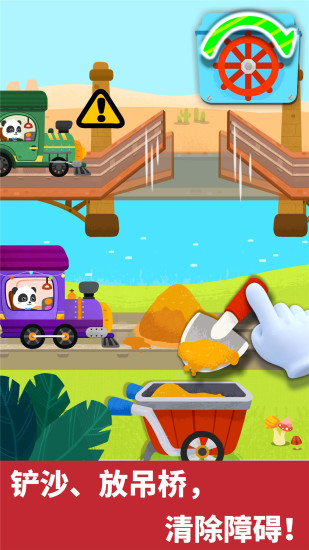 【宝宝小火车】中通过组装和模拟驾驶火车,让宝宝认知火车的构造、作用,学习乘车知识,体验驾驶乐趣! DIY小火车! ——学习火车结构 火车长什么样呢?帅气的车头,再加上长长的车厢、货箱,小火车就组装完成啦!驾驶它开启冒险之旅,Let's Go! 运货、载人! ——了解火车作用 长长的火车,有大大的能力,既能载人还能运货!快启动吊机,把苹果、西瓜装上火车运走吧! 火车乘坐指南! ——掌握乘车知识 乘客们要上车啦!宝宝帮忙检票、找出行李箱中的危险物品,引导乘客排队,安全乘车哦! 攻破路上7大关卡! ——提高解决问题的能力 小火车遇到困难了。宝宝快发挥聪明才智,放下闸栏、清理铁路、修好铁轨,让火车行驶顺畅! 下一站,沙漠! ——4大场景,培养观察能力 神奇小火车,加速前进!穿越田野、城市、隧道,驶向沙漠!沙漠有什么小动物呢?注意观察哦。 宝宝快和奇奇一起驾驶火车,开启新的旅行吧!
