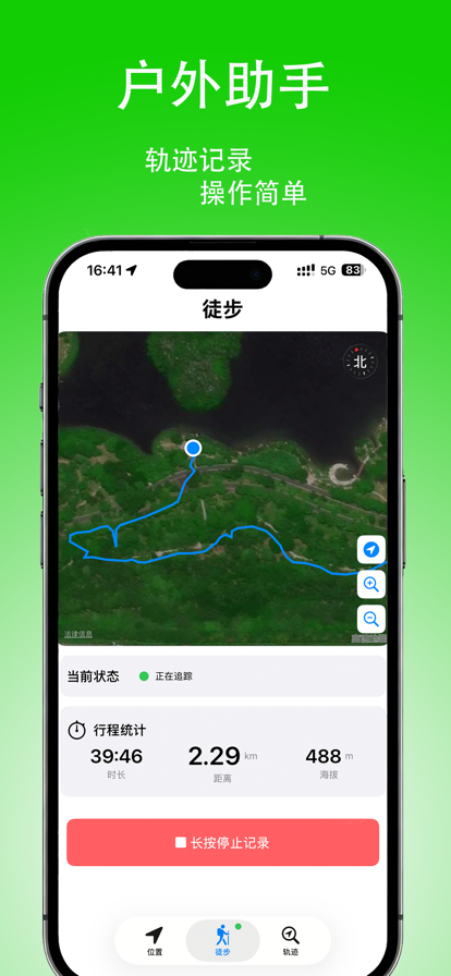 应用简介: 以前,走错路难以脱险,现在“轨迹记录”有备无患 以前,无向导满是凶险,现在“轨迹导航”值得托付 以前,人走失就是惊险,现在“组队功能”知己知彼 以前,购装备也是冒险,现在“户外商城”物美价廉 户外助手已经准备好,你,准备好了吗? 主要功能: 1. 轨迹记录。支持为轨迹附带多媒体信息,支持轨迹数据报表呈现,支持轨迹数据编辑 2. 轨迹导航。支持偏离报警,支持标注点播报,支持语音播报内容自定义。 3. 图源管理。自由添加更多户外用地图!最懂户外用户的心。 4. 运动协助。支持模式切换,支持运动目标设定,支持语音播报,支持线路指引,支持运动月报。 5. 轨迹云。丰富的轨迹数据库,支持个人云端备份,支持轨迹云端搜索,支持定点周边轨迹搜索,轨迹下载。 6. 离线地图。支持谷歌卫星地图,支持OpenCycleMap多功能等高线地图,支持百度矢量地图。 7. 轨迹导入导出。支持最常见kml、gpx轨迹格式导入,支持轨迹自由导出。 8. 语音提醒。GPS状态切换提醒,运动数据、位置闹钟语音提醒,最新状态、数据及时告知。 9. 兴趣点。随时随地收藏兴趣点。支持文字、语音、图片、视频多维角度描述。 10. 工具箱。整合位置闹钟、指南针、手电筒等七大最常用户外小工具。 Warning:Continued use of GPS running in the background can dramatically decrease battery life. This app uses the HealthKit APIs and integration with the Health app 警告:持续的开启GPS在后台运行,会降低电池的续航能力 本应用需要访问健康中心的数据