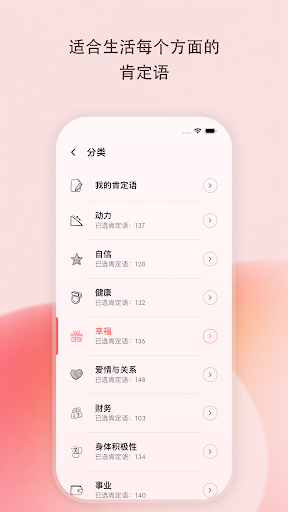 每日正能量肯定语,带来动力与幸福<br><br>欢迎使用 每日肯定语之镜 -- 这款应用帮助你通过每日积极肯定语培养动力、自信与幸福感。减轻压力,支持你的心理健康与身心幸福,每天塑造更积极的心态。<br><br>肯定语是简短而有力量的语句,可以促进自我成长、激发动力并改善心理健康。通过重复积极肯定语,你可以训练大脑用积极的想法取代消极思维,提高专注力并增强自信。随着时间的推移,肯定语能帮助你实现成功、平静与幸福。<br><br>主要功能:<br>📖 每日积极肯定语,提升动力、幸福、成功、自信与身心健康<br>🪞 镜像模式 -- 边看自己边背诵肯定语,效果更显著<br>🎵 放松的背景音乐,帮助你舒缓心情、支持心理健康并减轻压力<br>🎨 自定义背景,个性化你的肯定语体验<br>🗂️ 各种分类适合不同心情 -- 健康、动力、自爱、幸福、成功等<br>🔔 每日肯定语通知,持续给你启发<br>✍️ 创建属于自己的肯定语,并整理到自定义分类中<br><br>使用 每日肯定语之镜,你将能够:<br>• 提升动力与自信<br>• 强化你的心理健康、身心幸福与快乐<br>• 建立积极思维与自我关怀的持久习惯<br>• 在忙碌的日子里依然保持专注、平静与灵感<br>• 借助肯定语的力量实现目标与梦想<br><br>立即开始你迈向更加幸福、健康心态的旅程。<br><br>下载 每日肯定语之镜,开启积极肯定语的力量!