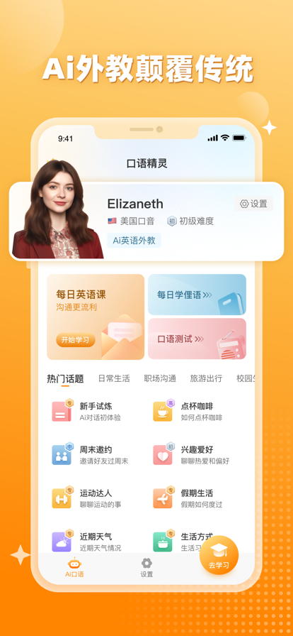 口语精灵是一款Ai智能口语学习软件,它主要用来进行英语学习和提高口语。如果你的目标是流利说出一口纯正地道的英语,口语精灵将会成为你的私人定制的英语口语教练。它涵盖从零基础英语到专业口语对话的学习,与市面上的英语学习软件相比,如多邻国(Duolingo)、流利说和一点英语等,口语精灵显得独特且颠覆传统。它可以为您提供近乎真人的1V1对话与互动体验,帮助您在各种生活场景中运用英语,提升口语能力,你能跨越国界,掌握世界各地的口语发音。 在今天的全球化背景下,英语无疑是重要的交流语言。无论是为了工作需要,还是为了旅行、留学,或者参加雅思、托福等英语水平测试,良好的英语口语技能都是至关重要的。这就是为什么有如流利说、多邻国、一点英语的英语学习App出现,然而,传统的学习方式往往存在效率低、体验差、兴趣不足等问题,这就是我们的Ai口语学习软件口语精灵想要解决的。口语精灵软件独特的人工智能(Ai)技术和真人语音技术结合的功能,使你可以与Ai老师进行1V1实时对话,在虚拟的句子练习、场景模拟和口语训练场景中,随时随地提升并测试你的英语听力和英语口语水平。 口语精灵颠覆了传统的学习方式。您只需要打开App,就可以随时随地与Ai老师进行对话练习,而且这个Ai老师采用了先进的人工智能技术以及真人语音模拟技术,提供了像真人一样流畅自然的对话体验。这就像您拥有了一位24小时在线的私人英语老师,随时为您指点,帮助您提升英语口语能力。 使用口语精灵,你可以体验到上百种训练场景模拟,还可以体验到四种不同口音,包括美音、英音等不同的口音风格,让你的英语学习更加丰富多元。同时,口语精灵特设发音评估建议的方式,让Ai老师对你的发音进行专业评估打分,实时纠正你的发音问题。无论您是初学者,还是英语口语较好的使用者,都可以在这里找到合适的训练模式,从基础发音练习、场景对话模拟,到雅思托福口语考试的应考技巧练习,样样都有,实现了听、说、读、写各方面的提升。 口语精灵并没有停留在基础的英语学习阶段,我们还为您准备了多样化的学习内容。对喜欢学习专业英语的用户,我们涵盖英语口语四级考试、英语口语六级考试、专八口语考试、BEC商务英语口语考试等专业口语考试的场景模拟。对于将要参加雅思、托福考试的用户,我们也设计了考前口语练习与应试策略,为您的考试成功保驾护航。 它的训练模式涵盖了各种生活、学习、工作场景,适应各个阶段学习者的需求。在应对各场景的对话模拟中,真人语音科技与Ai智能口语学习标配的教练模式,让您的英语越练越精准,越来越地道。而且无论是每日学俚语、每日英语课,还是专业化的课程设计,都是精心打造,以适应您的口语练习需求。口语精灵以此为我们在英语学习中提供了一种新的、高效的方式。 在听方面,Ai老师将亲自领读每一句对话,帮助你纠正发音,提升你的听力水平。在说的部分,有实时的对话模拟,你将得到AI老师的实时反馈和指点,学习如何更好地表达自己的观点。在读的环节,你将收到Ai老师专业的发音评估和建议,助你迅速提升发音准确度。在写的环节,Ai老师将为你提供逐句的语法纠错,让你的英语表达不再漏洞百出。 口语精灵不仅能助你提高口语,还能帮助你寻找和外教进行实时互动的机会,力求让你获得真实的语言环境体验。除此之外,口语精灵还提供了丰富的课程学习板块,如每日学习俚语、每日英语课等,结合专业的课程设计、Ai老师的领读、教学、评分一体化的练习节奏,让你的每一天都充满英语的学习和进步。 同时,口语精灵还特别关注英语口语练习的问题。每个英语学习者都知道口语训练是一项必不可少的练习任务,但大部分英语学习软件往往忽视了这一点。而口语精灵则是为你提供了真实的模拟口语考试场景,通过与AI老师的1对1互动,解决口语考试的难题,帮助学习者以较短的时间提升口语能力。 口语精灵相信,只要您肯坚持,就一定可以在学习英语的道路上取得进步。如果对于口语精灵有任何意见或建议,欢迎发送邮件至aitalkteam@outlook.com,我们热切期待你们的反馈,以更好地完善我们的产品,带给你更好的使用体验。 总之,无论你是零基础学英语的新手还是有一定基础想要进一步提升的英语学习者,只要你想提升你的英语口语水平,只要你希望通过学习英语开拓你的视野和拓展你的潜力,只要你期待着在Ai帮助下让你的英语变得流利起来,你都可以选择口语精灵。 关于条款: 隐私政策:https://aitalk.notehot.cn/privacypolicy-zh-cn.html 服务条款:https://aitalk.notehot.cn/termsofservice-zh-cn.html