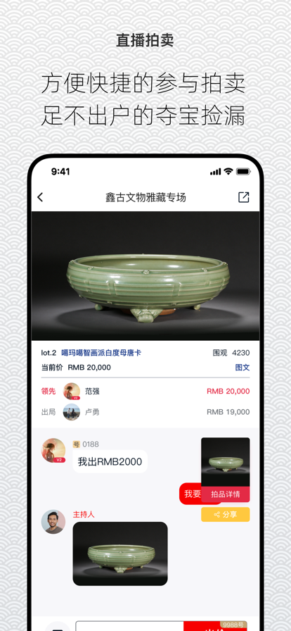 【直播拍】采用高清视频直播形式,买家可实时竞拍,与主持人聊天互动,交流拍品信息,感受现场竞拍氛围。 【延时拍】新增延时拍场,采用倒计时竞拍方式,让您更高效便捷竞买心仪拍品。 【资讯】为您提供文物艺术品收藏相关有价值的资讯。 【公司简介】 北京鑫古拍卖有限公司是一家文物拍卖文物拍卖公司。专注线上拍卖业务,严格征集把关,只征集开门有品质的拍品,以让收藏更安心为服务宗旨!拍品在品质严选基础上对拍卖规则施行保真制度,鑫古文物APP真正做到让您足不出户享受安心大拍! 【联系我们】 微信公众号:鑫古文物 客服热线:13911313672