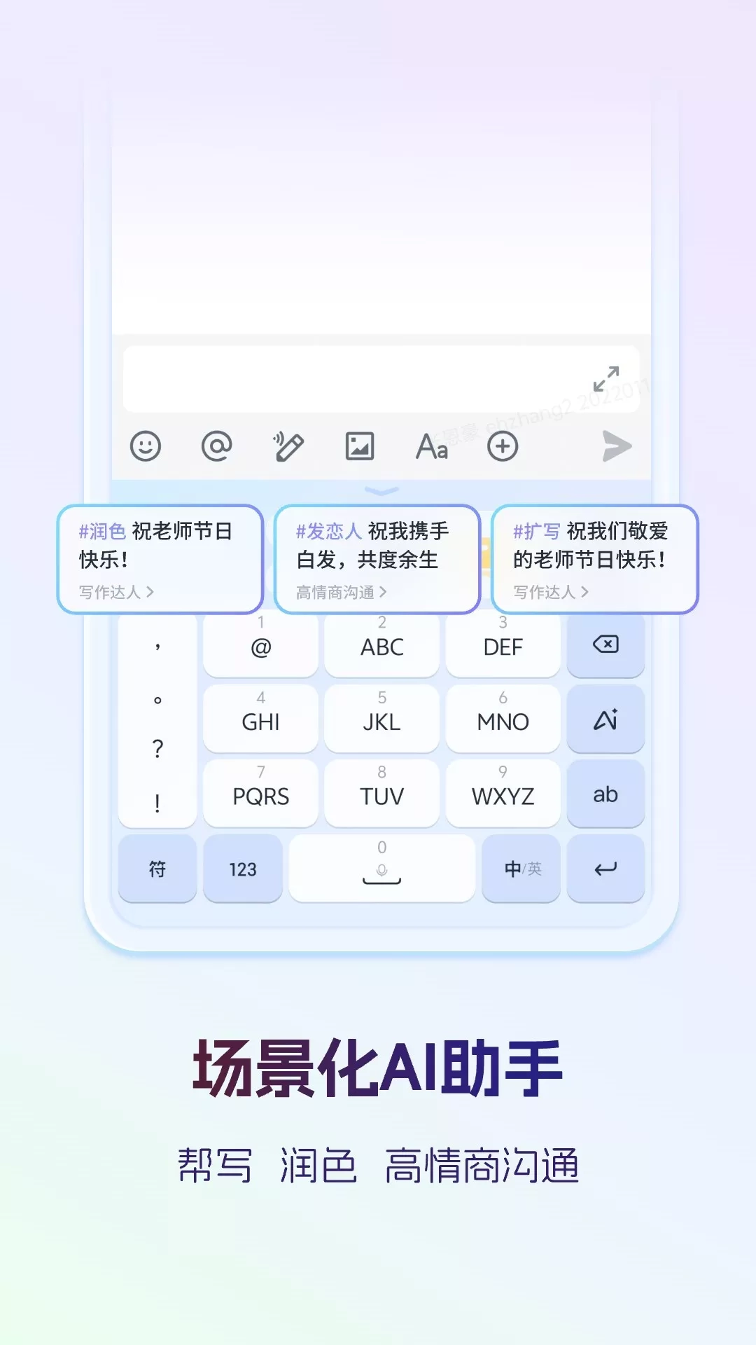 【主要功能】 【YAN键盘】颜/言/研新皮肤上线,多图轮播、文案百变,每次输入都有小惊喜; 【自定义皮肤】超多素材,支持多图DIY、百变文案DIY; 【智能预测】根据场景猜你想说,智能补全整句; 【AI智能输入】自适应输入场景,出词更智能; 【AI语音输入】支持中英混合免切换、方言免切换,更快更精确; 【离线语音】断网弱网语音输入一样准; 【AR表情】通过人脸识别技术制作多种逗趣表情; 【超大系统词库】50万系统词库,输入流畅,选词准确; 【人工智能引擎】智能整句输入算法加纠错算法,提高准确率; 【快捷搜索】边聊边搜,一步直达; 【游戏键盘】游戏短语、悬浮语音、和谐转换三大神器,助力上分、超神必备; 【懒人短语】内置多个短语分类,并支持添加个人常用语; 【自动同步】用户网络词、设置项、个性短语云端备份自动同步; 【超强中英混输】中文、英文、数字、符号自由混输; 【智能手写】支持叠写;边写边出字,识别速度快;毛笔字效果; 【超多输入方式】支持拼音、英文、笔画、五笔、语音等多种输入方式; 【语音速记】声纹区分角色技术首次在输入法登陆;