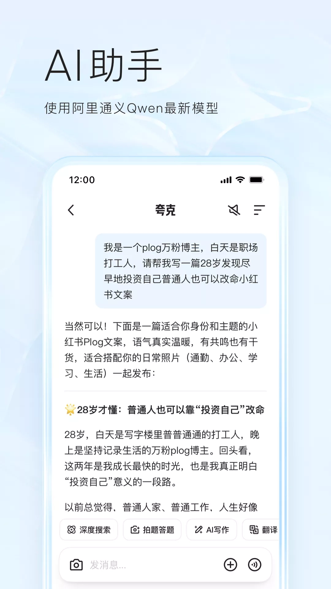 夸克是你的AI全能助手,由阿里巴巴自主研发,使用通义Qwen最新闭源模型。 通过全新的 AI 超级框与助手模式,融合搜索、对话、创作、学习与云端服务,无论你在学习、办公、创作或生活中遇到什么问题,夸克都能即时响应、深入分析,并给出清晰、专业的解决方案,为你带来高效、全面、可信赖的 AI 体验。 【AI 超级框】 一句话即可搜索、问答、总结、生成,连接网页、文档与知识的超级入口。 夸克会理解你的意图,从网页、视频、文档中提取要点,自动生成结构化结果。 支持图文、表格、视频等多形态展示,让你更快看懂复杂信息。 【助手模式】 全新助手模式,让夸克变成你可对话的智能伙伴。 它能记住上下文、理解语气和意图,帮你写报告、规划日程、解释概念、生成灵感。 你可以像与朋友聊天一样,与它自然交谈,边问边想,边聊边做。 【AI生产力工具】 AI写作:写方案、论文、报告、文案,一句话生成,逻辑流畅自然。 夸克老师:智能答题、知识总结、论文拆解,学习效率倍增。 夸克PPT:输入主题即可生成专业演示文档,自动排版与结构优化。 夸克翻译:多语言即时互译与语义理解,阅读外文网页更顺畅。 夸克扫描王:拍照识别文字与表格,自动提取、整理、总结。 【夸克网盘】 超大空间:6T超大空间,照片、文件安心存储。 多端同步:手机电脑随时看。 超级播放器:高清画质+AI字幕,刷剧更过瘾。 【夸克小说】 海量热门小说无限畅读。 从搜索到创作,从学习到整理, 夸克让每一次使用,都更智能、更轻松。 如果你在使用产品过程中遇到了任何问题或需要我们协助,请通过以下方式联系我们,我们将尽快处理! 反馈方式: -软件反馈:设置->意见反馈 -邮件反馈:kksupport@service.alibaba.com -官方网站:http://www.quark.cn