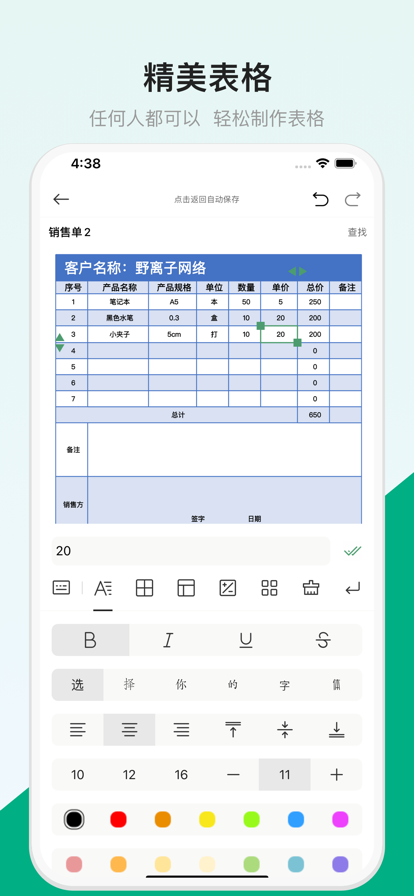 手机表格制作好帮手 - 小巧轻便,无门槛表格制作 - 功能齐全,表格常用的操作都有 - 数据云端存储,支持多设备同步 - 表格模板多样,快速选择生成新表格 - 稳定安全,数据加密上传,表格即改即存,还可随时恢复历史记录 - 分享多样,支持图片分享和表格文件分享,兼容xlsx等excel格式 软件内部部分服务需要购买会员,包括年、月、季连续订阅会员。 连续订阅会员说明: - 订阅周期:1年、一个月、一季度 - 付款:通过iTunes Store账户付款 - 取消订阅:如需取消订阅,请在当前订阅到期24小时前,手动到Apple ID设置管理中关闭自动订阅 - 续订:通过iTunes Store在到期前24小时内扣款,扣款成功后订阅周期将延续一年或一个月 - 隐私政策:http://www.onlybiaoge.cn/policy-ios/ - 使用条款:http://www.onlybiaoge.cn/terms-ios/