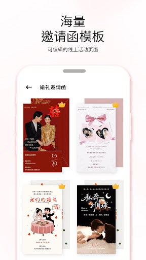 电子请柬制作APP可让您免费、轻松、快速地邀请好友。<br><br>使用我们的免费模板,制作婚礼邀请,生日邀请,周岁宴,满月宴,乔迁,寿宴,满月宴等等。<br><br>海量精美动画请柬,助你的邀请函脱颖而出!<br><br>如何使用APP<br>• 选择一个免费的在线邀请卡片,生日派对、满月宴、周岁宴、订婚宴、婚礼、百日宴、结婚请柬、升学宴、寿宴、商务邀请、圣诞节、情人节、感谢卡等<br>• 上传照片、视频和音乐,让请柬更生动<br>• 编辑字体样式,让请柬充满艺术感<br>• 可以分享到微信、朋友圈、Facebook、WhatsApp、LINE、WeChat、SMS等<br>• 当好友在请柬中回复,立刻收到通知<br>• 一键下载请柬卡片<br>• 轻松导出视频格式分享抖音,小红书收获更多美好祝福<br>• 实时查看宾客浏览记录<br>• 发送私人请柬更具仪式感<br>• 宴会地址一键导航