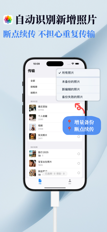 【相册备份功能】 - 无损备份:照片与视频不压缩,保留原始画质。 - 完整信息:拍摄时间、地点、设备型号和参数完整保留,未修改原片和已编辑版本全部保存。 - 兼容所有类型:支持实况照片、空间视频、GIF、连拍快照、慢动作等。 - 相册结构:按照手机中的相册分类和顺序导出,保持原有整理方式。 - 支持iCloud:可自动下载 iCloud 原图并传输到电脑。 - 增量备份:自动识别未备份的照片,下次仅传新增,更高效。 - 断点续传:中断后可继续传输,自动跳过已完成内容,避免重复。 - 高速传输:USB有线直连,上万张照片视频也能高速稳定导出,实测35MB/s+。 - 隐私保障:点对点本地传输,不经过任何云端,100% 安全可控。 - 多端兼容:支持macOS和Windows,也能备份到电脑的外置硬盘。 【设备要求】 - iOS 15及以上 - macOS 12及以上 - Windows 10 x64及以上 【操作提示】 - 您需要同时安装相册备份App手机端和电脑端传输。您可以点击手机App界面下方“更多”,选择“macOS应用程序”或“Windows应用程序”传输到您的电脑并安装。 - 如果您需要传输iCloud照片,您需要点击App界面下方“更多-偏好设置”,打开iCloud传输开关。 【联系我们】 - 邮件:oneshark666@gmail.com - 小红书:相册备份Albums Backup - 公众号:相册备份 - 您还可以在app应用内“更多-联系我们”入口进行反馈,我们会及时处理您的问题 【订阅方案】 - 年度订阅:18元/年 - 月度订阅:3元/月 - 如果您相册数据过多,需要订阅高级版才能将所有相册数据发送到Mac或PC,您可以先体验基础版,确定此应用程序满足您的使用需求再决定订阅高级版。 【自动续费说明】 - 订阅周期结束前24小时自动扣费,可随时关闭。 - 隐私政策:https://privacy.oneshark.com.cn/CameraRollTransfer-Subscription - 问题反馈:oneshark666@gmail.com - 用户协议:https://www.apple.com/legal/internet-services/itunes/dev/stdeula/
