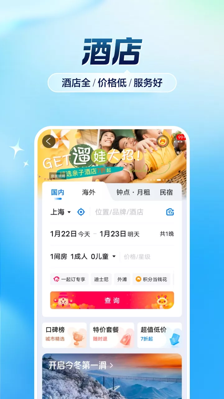 飞猪是阿里巴巴集团旗下旅行品牌,提供机票、酒店、火车票、汽车票、景点门票、用车、周末游、跟团游、自由行、自驾游、邮轮、旅游度假产品任您选!精选攻略、出行保险,旨在为您提供优惠、便捷、高性价比的出行服务。 [精彩活动] 1.「新人大礼包」首次下载飞猪App,即享百元飞猪出行大礼包; 2.「特价机票」每周四福利日低至2折,1元飞世界; 3.「特惠酒店」五星酒店五折住; 4.「飞猪会员日」会员可直接对等成为国内外五星酒店、国内各大知名酒店集团的银卡、金卡、白金卡,并尊享该等级所有会员权益; 5.「飞猪特卖」全网高性价比旅行商品,每天等你来; [特色服务] 1.「周边好去处」、「全球第一站」,分享旅行见闻,带你发现更多精彩; 2.享受先行赔付的「放心飞」服务,航空公司标准的退改签服务; 3.专享「信用住」酒店,免押金、免查房、免排队; 4.随时查看全球热门「目的地」攻略,旅游指南、行程游记、景点、美食、购物全掌握; 5.「领里程」当钱花,好货兑不停。