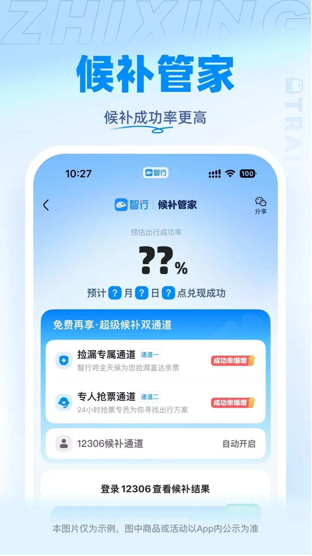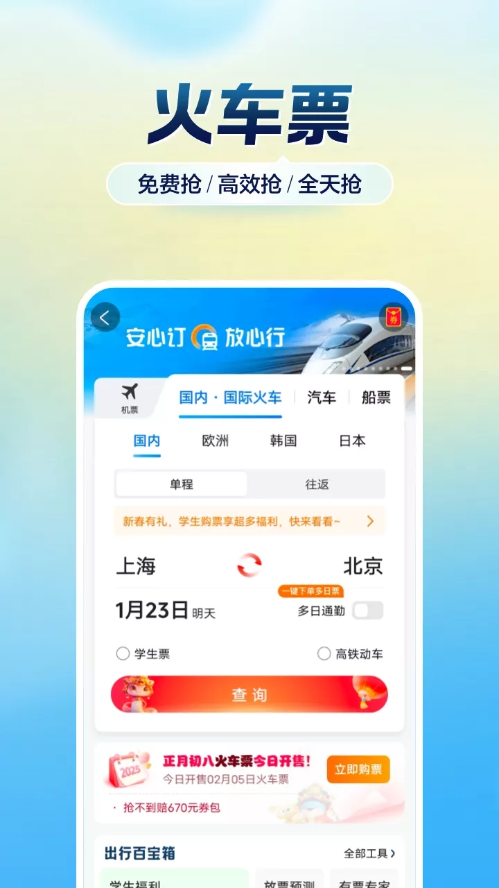 智行火车票(12306官方出票)-火车票、机票、酒店、汽车票、门票、船票一站式出行预订平台。 出行神器,提供火车开售时间、正晚点、候补人数查询等一站式出行服务,功能全面助您旅途顺心! 主要产品与服务: 【火车票】 [线上选座] - 在线选择心仪座位,下铺、靠窗随心选。 [免费车票] - 积分兑车票,0元免费坐火车。 [自动抢票] - 可提前预约下单,开售时自动秒杀出票;不仅抢候补,也能抢余票。 [24小时抢] - 可全天24小时抢票,有专人帮抢,成功率高,抢不到就敢赔。 [抢票福利] - 靠窗、下铺免费抢,学生还有全年免费抢票福利,抢不到免费升坐席。 [余票捡漏] - 各条线路隐藏余票一键检索,免费监控,即刻解决无票难题。 【特价机票】 买机票,先来智行比价,全球低价尽在智行。 【低价酒店】 独家功能,低价监控,有房监控,平台还可以帮您跟商家还价,低价不错过。
