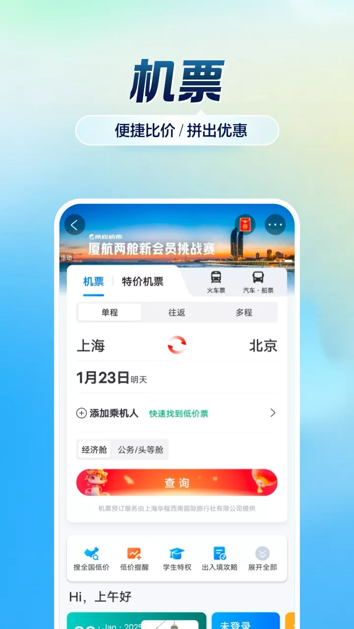 作为业界权威的在线旅行服务公司,携程旅行酒店预订平台覆盖了全球约1400000家酒店;机票产品覆盖300多家国际航空公司;这些航空公司运营着全球各大城市的航班,提供了超过200万条航线,连接了大约200个国家和地区的5000多个城市;在出境游服务上,与约12000个合作伙伴一起为客户提供综合的旅行服务;提供了中国大陆及港澳台地区、欧日韩等境外地区火车票预订;提供国内/国际汽车票预订及城际用车服务,其中国内覆盖3000家以上的车站,提供国内超过410个城市、国外200个国家、80000家门店、700万车辆的自驾服务;提供超实惠的景点门票等预订服务;更有旅游度假、主题高铁游、景点门票优惠、旅游攻略、旅行购物指南、旅行WiFi等一站式旅行服务,助你实现说走就走的旅行梦想。