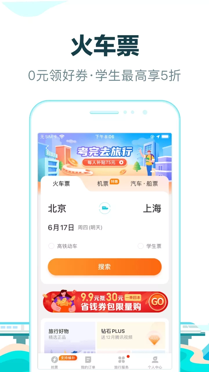 同程旅行,新一代旅行平台。 作为中国的优质在线旅行服务提供商之一,为2亿用户随时随地提供专业的机票、酒店、火车票、汽车票、门票、国内外度假线路等全方面旅游产品的在线预订服务,让用户享受更便捷、更舒适的旅行。 【产品功能】 1、新客礼包:同程旅行APP新用户可在同程APP内参与领取新客大礼包,内含国内机票、火车票、国内酒店、景点门票、汽车票、打车等新客专享红包,先领券再下单更划算,详情以活动内规则为准。 2、火车票:购票便捷,支持在线抢票、在线选座;票种多样,支持成人票、儿童票、学生票;智慧出行,智能推荐火车中转、多买几站、同车换乘等出行方式。 3、酒店:百万家酒店覆盖国内海外,钟点房/品牌连锁/民宿等多形态应有尽有,亲子/差旅/度假等多场景一应俱全。 4、机票:特价机票天天有,最低1折起;价格透明,大额优惠券天天领;免费选座,在线值机,随时掌控航班最新状态;线上退改更便捷,退改签不收取额外费用。 5、门票:全国海量景点优惠订,特价门票5折起;极速出票快乐游,免票入园不排队,无忧退订有保障;支持在线预约,无接触式购票安心游! 6、打车:一键呼叫全网打车平台,享受省心、便捷、快速、安全的