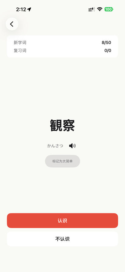 一款极简的 JLPT N1-N5 单词记忆应用,把所有步骤都做到最简化,只需简单点击“开始学习”便可开始沉浸式记忆学习。 ·无需焦躁要点复习又要点学习,无需焦躁单词被切成一组一组打乱思绪 ·没有繁复的界面 ·快速用“认识/不认识”完成记忆 ·单词、释义、例句一目了然 ·无广告,完全免费 每天打开一次,帮你记下JLPT 10000+词汇