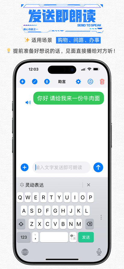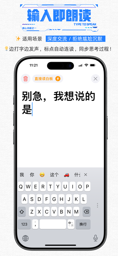 1. 输入即读(重要) 输入文字点击发送,即刻朗读,零延迟。 2. 单击重播 点击历史消息气泡,即可再次播放语音。 3. 双击放大 双击气泡全屏展示超大文字,方便在嘈杂环境中直接出示给对方观看。 4. 长按回填 长按气泡可将文字自动复制回输入框,便于快速修改错别字或补充内容。 5. 循环播报(重要) 人类的本质是复读机。开启后持续循环播放选中或新发的语句。这是在嘈杂环境中引起注意、或在争论中表达坚定立场的利器。 6. 一键连呼 长按发送键唤起。短促有力的连续呼唤。选好次数(3-6次)后自动连发,专为急需引起注意、但又不需要持续复读的场景设计。 7. 辅助听觉 “让输入法帮你听”界面,引导对方使用输入法的语音转文字功能,让他的声音变成屏幕上的文字,实现有来有回的双向交流。 8. 白板·整读 (重要) 为了让对方看着舒服。专为“边打边看”设计,你负责打字,对方盯着屏幕预读。标点/换行才触发朗读,视觉不乱跳,沟通效率倍增。 9. 白板·速读(重要) 整读进阶版。打破标点束缚,打字即读。虽牺牲了连贯韵律,但换来了极致的响应速度。输入完毕,亦可整句重播。 10. 智能常用语(重要) 你的私人词库。既支持手动分类预设,也具备智能推荐功能。系统会自动捕捉你的高频“口头禅”并优先展示,越用越懂你,让沟通快人一步。 愿每一个声音,都能被世界听见。 by 青海阿卷
