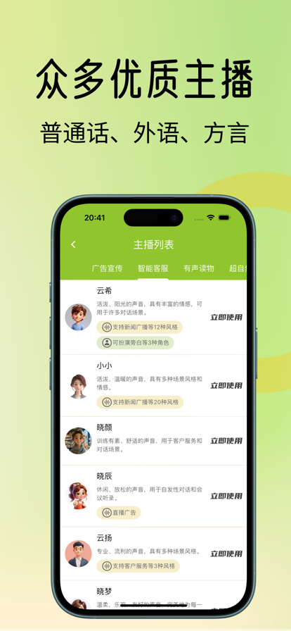 专业文字朗读配音APP,支持广告配音、语音合成。在线朗读。多种风格主播,音色媲美真人! - 逼真的合成语音:支持多种场景和情感,使人声的语调和情感匹配,发音自然。 - 多国语言支持:跨129种语言及变体,AI神经网络合成自然的人声。 - 中文方言支持:支持四川话、东北话、山东话、陕西话、河南话、粤语、台湾话。 - 多种角色支持:支持男声、女声、童音、长者、解说员等等。 - 多种情感支持:生气、欢快、悲伤、激动、亲切、害怕、聊天、客服、冷静、新闻播报、深情、广告宣传等等。 - 语速和音调:支持调节主播的语速和音调,让配音更加自由。 - 保存常用音色:支持将调节好的音色配置保存为常用音色,方便下次直接使用。 - 图片拍照识别:支持通过拍照或图片OCR识别文字导入。 - 音频文件导出:支持合成完毕的人声音频文件导出。 文字转语音专业版: 订阅音频提取器专业版以便获得更多出色功能: - 全场无限制使用所有高级功能 - 解锁高级播音员音色 - 解锁OCR图片识别文字 - 不限制文本字数 - 不限制每日下载次数 - 去除所有广告 * 确认购买后,订阅费用将会记在您的iTunes账号下。 * 除非在当前订阅周期结束的24小时以前关闭自动续订,订阅将会自动延续而费用将记在您的iTunes账号下。续订的费用取决于您的订阅计划。我们的标准订阅计划包括: * 1个月的订阅 * 1年的订阅 我们同时还提供永久解锁的方式。 当使用其他货币时,价格会按照苹果商店的定价矩阵使用相等的价格层次。 *有免费试用期的订阅将自动续订至付费订阅。在购买后,您可在账户设定中取消或者管理您的自动续订。 订阅取消会在当前订阅周期最后一天的24小时后生效,您将会被降级为免费服务。 *请注意:当您在免费试用期内购买高级订阅时,免费试用期中任何未使用的部分(如提供)将失效。 如果您在使用中对我们可以如何改进这个应用有任何问题或建议,请不要犹豫,立即通过miosofia@outlook.com联系我们。 隐私政策:https://app.yoyos.top/ttser/w/privacy.html 使用条款:https://app.yoyos.top/ttser/w/terms_of_use.html