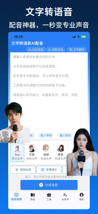 百人团队打造专业配音神器,采用目前先进的AI文本转语音合成技术,声音专业、自然、舒适配音,媲美人声,你想要的声音都在这里。工具清晰简洁,便于上手,很多操作一键完成。 我们这款工具内置了百位主播,并且还在不断更新中,无论是影视解说文案转音频场景,还是各类方言搞笑段子,温柔情感号配音,又或是新闻播报,可爱童声,甚至各国小语种均可完成,实现媲美专业配音师的自然效果。 【强大的配音功能】 1、一键导出:一键文本转语音合成,一键导出多种音频格式到手机,电脑,内存卡,U盘或分享给朋友,并支持朗读试听试用; 2、背景配乐:支持海量背景音乐,文字转语音时支持调整语速、语调、音量、背景音量等,并记录您的操作习惯方便下次再用; 3、超多语种:支持各类小语种,方言,如广东话,天津话,河南话,东北话,英语,日语,越南语,马来语,韩语,印尼语等; 4、超多模板:想不出广告词,广告促销,地摊叫卖,美食餐厅,产品宣传等众多行业海量模板供您挑选,一键配音; 5、语速调节:自由调节配音语速,可自定义插入停顿,配音效果自然流畅; 6、声音风格:发音人可选不同说话风格; 7、智能便捷:软件清晰简单,便于上手,功能强大; 8、智能矫正:配音助手支持多音字纠正。 9、云端存储:作品永久云端储存,方便二次创造。 【适用场景】 1、广告配音:商场广告促销、地摊叫卖、企业宣传、影视配音等; 2、英语读物:制作各类英语配音,英语听力音频制作等; 3、有声阅读:小说、杂志、课本、童话,打造属于你的个性化听书APP; 4、广播类:学校、企业、车站、机场、商场的广播播音; 5、配音类:动画片、flash影片、各类广播剧; 6、影视类:广告片配音、影视片配音、专题片配音、动画后期配音; 7、工业用声:防盗、报警、车辆船舶导航系统的语音录制; 8、出版物:有声读物、文艺作品、课件、培训软件的语音录制; 9、自有视频配音:快手等自媒体视频快速配音,适配剪映、快影等本地导入功能。 专业团队为您护航,值得各位配音达人下载APP使用!!! 【会员服务】 会员购买方式为:连续包月(月费会员,自动续费),年会员(不自动续费),永久会员(不自动续费)。 【自动续费规则】 1.订阅月费会员服务会通过iTunes账户直接支付。 2.在订阅服务到期前24小时,系统将按订购类型进行自动续订和扣除相应费用。 3.如需关闭连续包月服务,请至少提前24小时在“账户设置”中进行操作。请手动打开苹果手机的“设置”—>进入“iTunes Store与App Store“—>点击”Apple ID“,选择”查看Apple ID“,进入”账户设置“页面,点击”订阅“,选择月费会员 取消订阅即可。如未在订阅期结束的至少24小时前关闭订阅,此订阅将会自动续订。 使用轻语配音即表示您同意我们的使用条款和隐私政策: 服务协议:https://pyapi.qingyu.club/agreement/user.html 隐私协议:https://pyapi.qingyu.club/agreement/privacy.html 自动续费协议:https://pyapi.qingyu.club/agreement/renew.html
