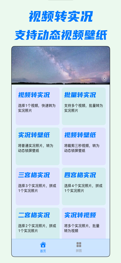 把手机里的烟花雪花新年视频,制作成动态壁纸真的好有感~快来试试吧!让视频秒变实况照片!让视频秒变动态壁纸!让实况像照片一样拼图!设计简约但功能强大,支持批量、快速、一键转换,轻松制作实况照片Live Photo、动态壁纸视频墙纸。还不知道怎么做实况照片?赶快用起来吧!专为制作竖屏视频(宽高比9:16)而优化,随时分享至朋友圈、小红书、微博等社交媒体,精彩瞬间也能富有顽强的生命力! 核心功能:视频转实况、动态壁纸制作、实况拼图 • 动态壁纸制作 支持导入视频做成动态视频壁纸,也支持把你的实况转成动态的锁屏壁纸。好看,也好玩,快来试试吧 • 视频转实况照片 一键将视频转换为高质量的实况照片,保留每个细节和动态。无论视频时长多长,转换过程流畅快速,完美展现每个精彩瞬间。 • 批量快速转换 支持批量处理多个视频,一键操作,快速转换多个视频,省时省力,轻松搞定,极大提高效率,而且速度也很快,美好无需多等。 • 实况照片拼图 像拼图一样拼实况,将多个动态的实况照片拼接在一起,一张动态图瞬间包含多种画面,传达更多美好精彩瞬间,是朋友圈和小红书非常火的玩法,现在可以一键制作啦! 还有什么呢? 好看好玩:一键制作动态视频壁纸 自动保存:自动保存制作的实况照片到相册 简单好用:设计简约清晰直观操作简单 轻量开发:应用体积小运行流畅节省存储空间 没有广告:喜欢简约简洁更好用专注功能实现 立刻下载,让您最喜爱的时刻重现!! ------------------------------- 关于订阅: --订阅服务:连续(周/年)会员 --订阅周期:一周/一年;订阅周期内,用户可使用无广告、全部功能、保存作品无水印等相关会员功能 --会员付费:确认购买后,将从用户的苹果iTunes账户支付 --取消订阅:若需取消自动续费,请在订阅周期到期24小时前关闭,关闭后不再扣费,若未在到期前24小时关闭自动订阅,将自动续订 --自动续订:苹果 iTunes 账户会在到期前 24 小时内扣款,扣款成功后订阅周期自动顺延响应周期。 ------------------------------- 用户协议:http://a.kuaixiezhen.com/a?a=6740474389 隐私政策:http://a.kuaixiezhen.com/p?a=6740474389