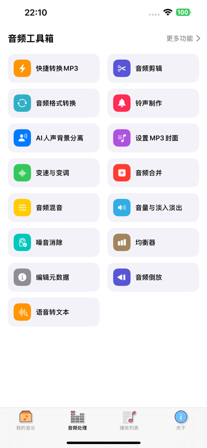 *支持各种音频格式转码,包括(aac/m4a, mp3, wav, amr, ac3, wma, flac, ogg, caf, opus) *支持制作铃声 *支持从各种视频提取音频 *支持音频实时渲染,可以实时听特效渲染效果(男生女生互变,ktv音效,音频快速/慢速播放) *支持音频裁剪 *支持音频拼接 *支持音频混音 *支持音频降噪 *支持从麦克风录入 *支持从相册提取 *支持从iCloud提取 *支持从电脑端传入提取