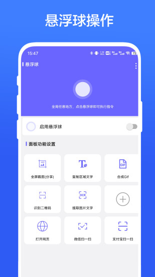 便捷流畅的安卓虚拟按键,相信您用过会回来好评的! 产品特点: --自定义悬浮点,一键设置的Easy Assistive Touch。 --最近任务管理,无需Root,可关闭最近任务、在多个任务间快捷切换。 --添加常用程序,安全、高效、便捷。 --虚拟按键,免root,完全替代物理按键(锁屏、返回、Home键、音量键等),延长系统按键近两年的寿命! --自定义快捷方式,打开手电筒、启动照相机、开关WIFI和移动数据、调节音量和亮度等。 --Material Design极简设计,iOS风格漂亮的主题。 --人性化体验,阅读、游戏、看视频,不用退出程序即可调节亮度等,不占据屏幕空间,不遮挡视线。 --流畅的交互,长按iPhone小白点隐藏至通知栏,点击通知栏即可悬浮在桌面;方便单手操作,大屏手机的辅助神器。