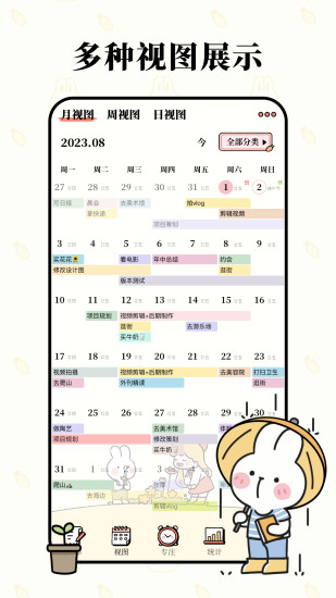 高效打卡计时软件,结合了用户最需求的清单打卡、月视图、番茄钟功能,帮助用户专注任务、按时打卡。 番茄计划重点开发的清单打卡及专注计时功能,配合规划任务的四象限、集合每月清单的月视图,结合热门的番茄钟计时规则,帮助用户掌握学习和工作生活的方方面面。 【四象限】科学划分任务紧急程度,每天打卡一目了然 【月视图】可爱又好看的每月清单视图,阅览每月任务 【番茄钟】科学合理的计时方式,配合翻页时钟、横屏样式 【统计数据】看到你点点滴滴的打卡记录和计时时间,成就感满满 【专注模式】学霸模式、翻转模式、严格模式,帮你远离手机 【更多计时】正计时、倒计时两种计时方式,计时更灵活 【自动同步】换设备自动同步数据,无需会员即可享用 番茄计划颠覆了沉闷的、单调的效率App风格,功能更精简、产品更轻盈,配合可爱的产品风格,带给您全新体验~ 更多功能正在优化开发中,敬请期待哦~