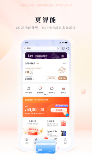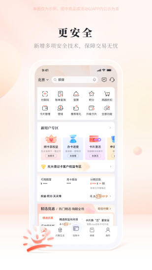 光大银行信用卡“阳光惠生活” 阳光惠生活是光大银行信用卡唯一官方App。为用户打造安全、便捷的一站式金融服务平台,提供“金融+生活”全场景产品与服务。 【首页】聚焦金融服务,查账还款、额度管理、分期、借钱、扫码支付、申请新卡,金融服务一键直达。精选热门活动,签到领积分、周五红包、商城特惠、金知了社区热议话题,精彩纷呈等你来探索。 【约惠生活】每日不定时更新超值饭票、专属消费权益和限时优惠活动!覆盖餐饮/购物/娱乐全场景,天天解锁立减券、爆款秒杀、积分兑好礼。 【信用卡】快速查询账户信息,贴心提供月度消费报告。账单还款、分期还款、快速提现、绑定手机支付、积分兑换,提供信用卡全方位服务。 【商城】超值好物,每日限时秒杀!支持免息分期购物,最高可分12期,无压力享品质好物。 【我的】设置“山海经”“三国”等主题国风皮肤,打造个性空间!“星光俱乐部”会员权益持续升级、积分可兑海量好礼,用心陪你惠生活。 联系我们 如果您在使用过程中遇到任何问题,欢迎通过以下联系方式联系我们: 1、在线反馈:通过“在线客服”或“我的-意见反馈”提交您的意见建议 2、客服热线:95595