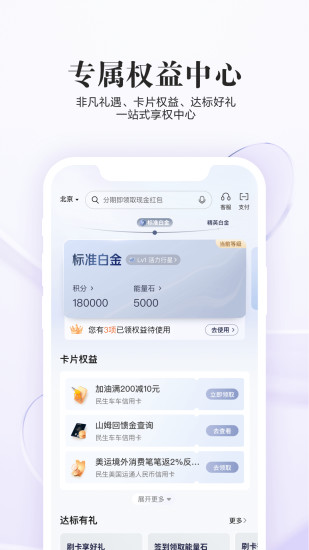 【精选】发现生活精彩,想你所想,一键直达海量精彩 【权益】专属权益中心,非凡礼遇、卡片权益、达标好礼,一站式享权中心 【聚惠民生】解锁聚惠全场景,活动日历、5折餐饮、尊享月卡,聚惠全能助手 【金融】随需而贷 账单管理一站式金融服务 【我的】管理账户信息,安全设置,支持版本切换,为客户的金融服务保驾护航 获奖情况: 2024中国银行保险报金融消费者权益保护优秀案例 2024银行家年度网络金融创新优秀案例 2024“数英奖•DAOY 年度奖”金融领域年度品牌称号 2023年中国网财经中国鼎金融业年度金融消费权益保护优秀案例 2022福布斯中国客户服务企业TOP 100 2022中国银联云闪付网络平台推广突出贡献奖 2022消费日报社消费市场行业影响力品牌 2020中国扶贫基金会杰出贡献荣誉 2020银行家杂志十佳金融科技创新奖 2020中国社会科学研究院金融研究所中国金融创新奖 2019中国人民银行年度银行科技发展奖二等奖 2019商业银行APP客户体验奖项评选活动创新奖 官网地址:http://www.creditcard.cmbc.com.cn 24小时服务热线:400-66-95568