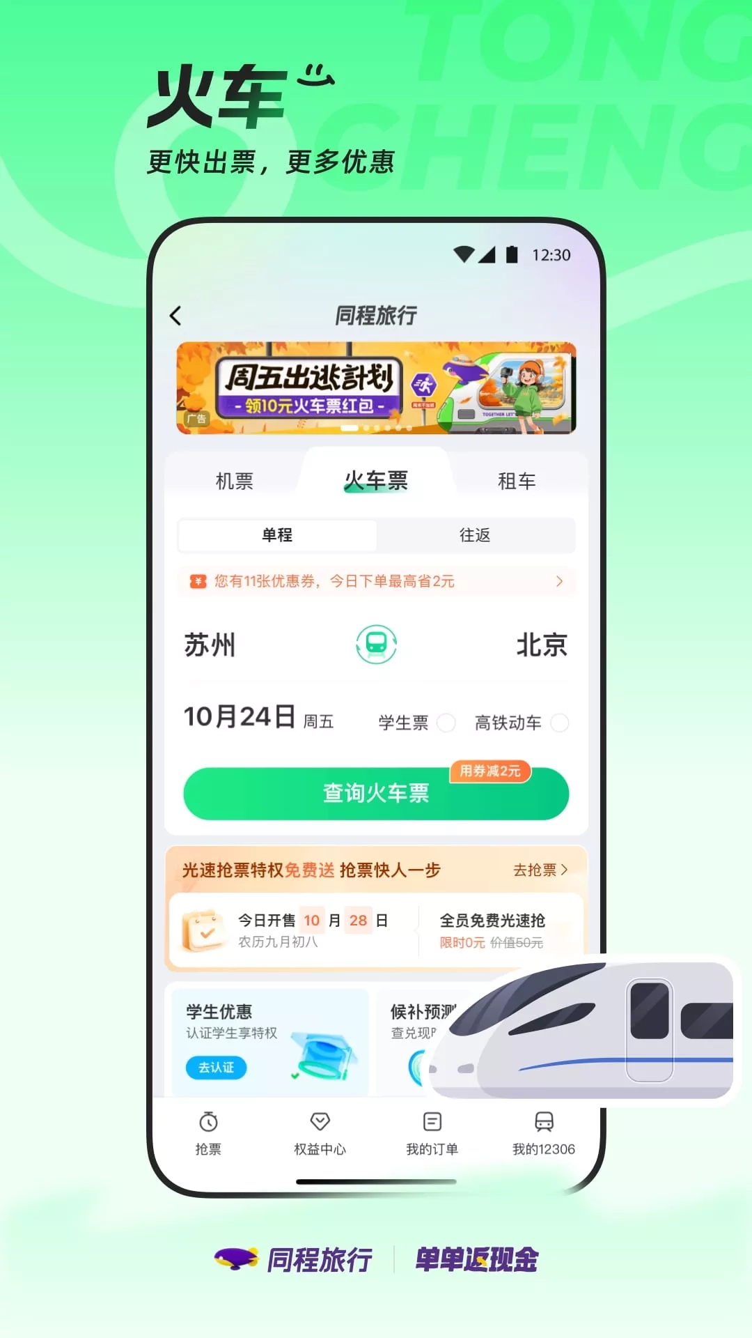 中国铁路出品,人民铁路为人民,买火车票就用铁路12306!铁路12306网站(含手机客户端)是中国铁路唯一官方火车票网络售票平台,从未授权任何第三方平台发售火车票。 我们的特色: 【售票无加价】不收取加速包费用,不捆绑保险销售,不收取会员费,让您购票放心。 【信息更准确】晚点、停运信息,列车出发、到达信息,车厢、车型信息,第一时间获知,让您出行安心。 【功能更全面】火车票、机票、汽车票、网络订餐、酒店住宿、旅游等近百项功能,让您旅行无忧。 【服务更温馨】满足老年人的大字版,满足视障等特殊人群的无障碍版,让您使用便捷。 主要产品及服务: 【火车票预订】 1.无票候补。车票售完不用慌,无票候补帮您忙。提交候补需求,当因退票、改签或新增列车等产生可供发售的车票时,自动为您出票。 2.选座选铺。喜欢靠窗看风景?喜欢靠过道便捷?喜欢上铺清净?喜欢下铺方便?选座选铺一键指定心意座/铺位。 3.智能中转。没有直达方案?中转服务智能为您推荐换乘方案。 4.车站大屏。查看列车出发、到达信息,让您轻松掌握行程,送站接人更加便捷。 【机票预订】 航司官方直营店入驻,官方机票服务,购票更安心,出行有保障。 【汽车票预订】 覆盖全国随时出发!提供国内公路客运信息、汽车站、线路时刻的查询及汽车票预订服务。 【联运服务】 提供空铁公水多交通方式一站式购票及信息查询服务,省时省心,出行更多选择。 【出行服务】 提供高铁订餐、酒店预订、约车接送站、铁路游、景区门票预订、铁路商城、出行保险等服务,吃住行游购娱,一款APP满足您的出行需求。 【温馨服务】 提供临时乘车证明、重点旅客预约、遗失物品查找等便捷服务功能,让您出行无后顾之忧。 【会员服务】 提供会员权益及支持使用积分兑换车票等相关服务。 更多信息请关注 微信公众号:铁路12306