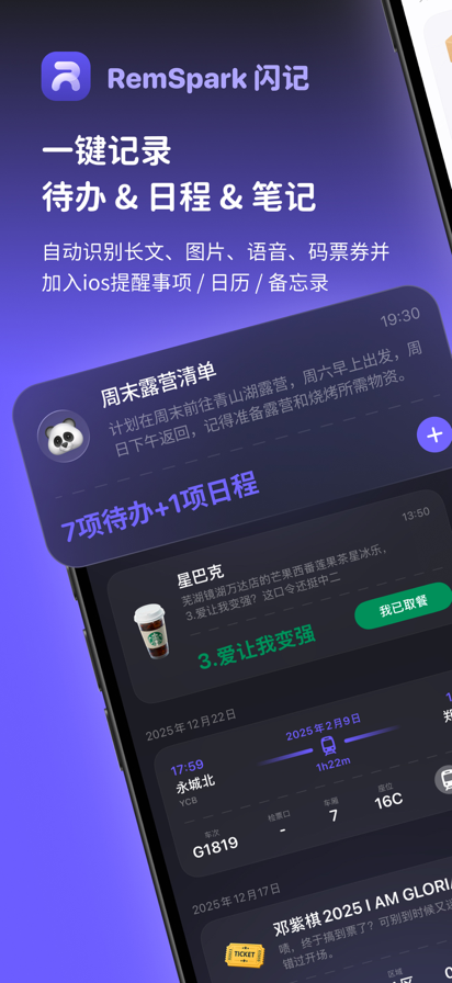 RemSpark 是一款把碎片信息直接变成行动的 AI 助手。无论是长文本、聊天记录、截屏、语音,还是短信和邮件里的取件码、票券、停车位置、排队预约、紧急通知,RemSpark 都能自动识别重点,并整理成待办、日程、笔记、提醒或灵动岛信息,深度联动苹果原生的「提醒事项」「日历」「备忘录」。 朋友发来一长串安排、停车后忘了车停哪层、餐厅候位快到号、交警催挪短信不敢错过、电影票和车票散落在不同 App、取件码和取餐码总在通知里翻来翻去,这些高频又琐碎的场景,都可以交给 RemSpark 一次收住。 【核心功能】 - 停车位置 / 排队预约 / 紧急通知识别:支持识别停车楼层、分区、车位、地标;记录排队号码、进度与到号时间;识别高风险官方紧急通知(如交警催挪、金融账户安全风险),并可触发闹钟提醒(iOS 26+)。 - 文本、截屏、语音一键整理:自动识别时间与关键信息,把聊天记录、会议内容、学习计划、零碎想法快速整理成待办、日程或笔记。 - 票券识别:支持机票、高铁票、电影票、演出票识别,可直接联动提醒事项、日历与灵动岛。 - 取餐码 / 取件码识别:一键提取关键信息,在灵动岛查看与处理,也可加入提醒事项,减少遗漏。 - 待办计时与统计:支持开始、暂停、继续、结束计时;自动汇总总时长、计时次数、平均时长与专注分布,结束后可同步到日历形成时间块。 - 实时活动与快捷指令:支持通过快捷指令快速启动识别、闪记与计时;可在灵动岛查看关键状态,并支持透明锁屏实时活动背景。 - 一键同步苹果原生应用:将待办、日程与笔记分别写入「提醒事项」「日历」「备忘录」,通知稳定,使用无缝。 - 发散整理与个性化陪伴:一句话生成清单,也可选择不同角色语气,让提醒和记录更贴近你的习惯。 每一段碎片化信息,都值得被好好托住。 让 RemSpark 帮你把生活变得更轻松、更有序。 服务条款:https://www.apple.com/legal/internet-services/itunes/dev/stdeula/