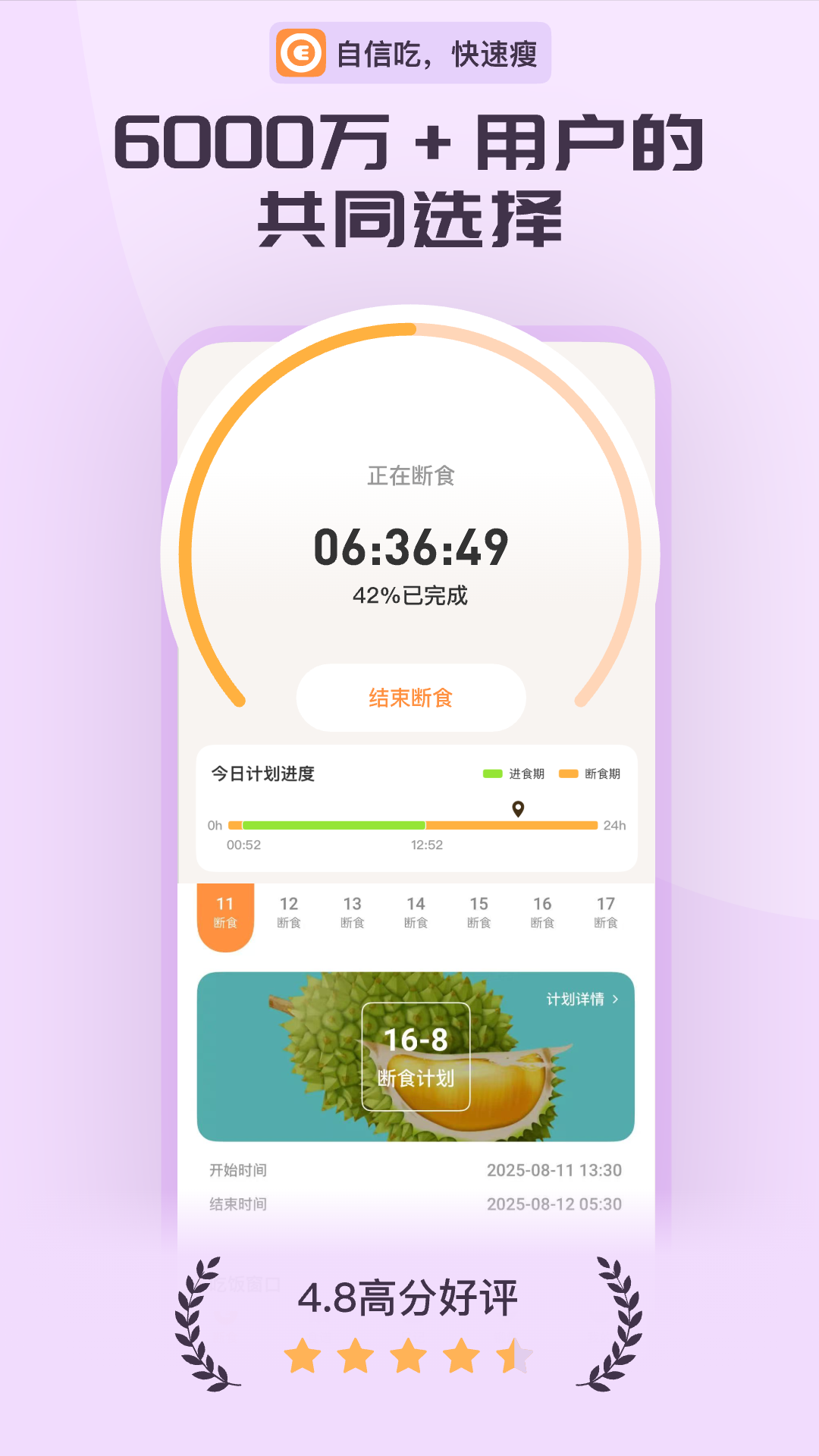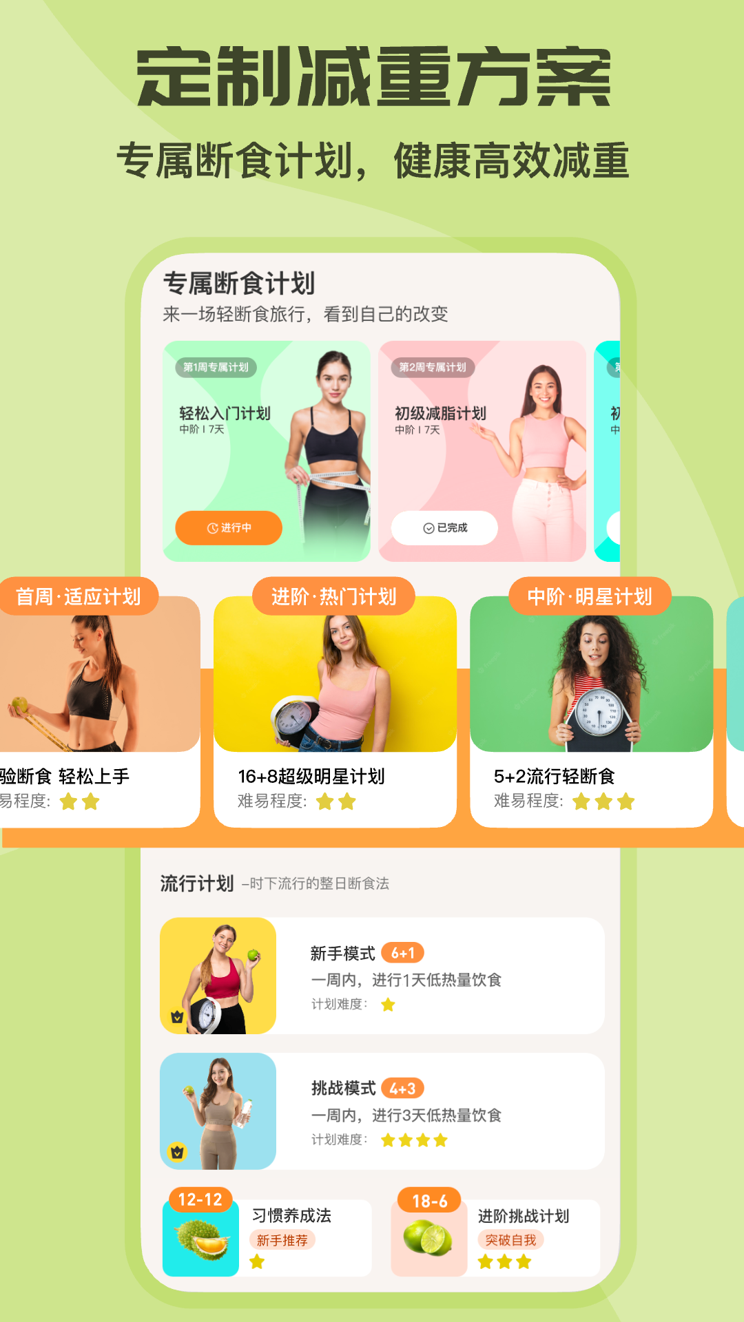 【个性定制轻断食】<br>自信吃,快速瘦:轻断食计划选择:16+8、18+6、20+4、OMAD断食计划<br>轻断食食谱:科学搭配每日健康轻食食谱,解决你在饮食期间不知道吃什么的烦恼。<br>记录数据可视化:<br>记录你身体断食过程中体重、饮水量、断食时间等各项数据,生成相应的数据表单,让你见证身体的变化过程,给足你坚持下去的动力。<br>海量食物库:营养元素和卡路里热量精准查询,让你吃的明白、瘦的快~<br>饮水提醒:根据每个人饮水量,随时记录你摄入水分,提高新陈代谢,让你养成喝水的好习惯!<br>下载这款app,今天开始变美变瘦吧~<br>让我们一起期待真实的你!