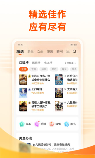 【最舒适的阅读体验】 阅读不卡顿,让你的阅读体验如呼吸般自然,高质量小说用户必选 【阅读性价比最高】 收录全网热门小说,玄幻、都市、言情、总裁几十万本小说 【阅读书荒不在怕】 书籍分类种类多。按热门、主题、情节、角色,分类清楚明白 找书再也不用愁 【全网爆款、影视原著一网打尽】 《斗罗大陆II绝世唐门》唐家三少经典力作,百万读者免费追读!万年之后,斗罗大陆上续写唐门辉煌神话! 《万族之劫》火爆全网的都市异能小说,老鹰吃小鸡登顶之作!从万族的劫难开始,到劫难的万族结束,来来回回之间的一段热血传奇。 《庶女攻略》谭松韵、钟汉良主演电视剧《锦心似玉》原著小说!古言大神吱吱成名之作,宅斗经典,不容错过。 《赘婿》郭麒麟、宋轶主演热剧同名原著小说,且看古代商贾家毫不起眼的小小赘婿,如何在动荡乱世中恣意人生! 《明天也喜欢》言情天后叶非夜现言新作,火热追更中! 《神医毒妃逆天宠》大热古言必读!一朝穿越,废材变天才。欲毁我者,满门皆诛! 更多火热好书、热门分类,玄幻仙侠、都市爽文、现代言情、古言穿越、幻言女强……你想看的我们全都有!