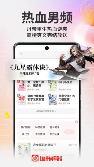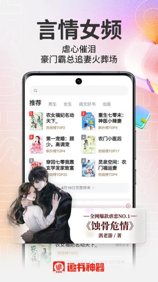 【2024年度金榜大赏即将揭幕】 千万读者见证、上亿张金选票的选择—— 2月中旬,年度金榜书单即将揭晓,为佳作荣誉加冕! 蝉联金榜一周年的NO.1,提前锁定榜首之位! 累计获得488.7万张金选票, 近千万读者追读, 数万人打出9.5分高分的佳作, 《第一御兽师》, 入站必看! 书籍介绍: 全球异变,魔兽入侵。 御兽师,肩负起拯救人类文明的重任。 肖星宇穿越后,觉醒【神级御兽系统】。 开启魔神之眼,可以看穿所有御兽隐藏进化路线、激活隐藏血脉、开启无限进化…… 多年后。,肖星宇身边上古神兽环绕,混沌天元龙、燃血凤凰王、冥府夜麒麟、弑神堕天使…… 身为龙国最强御兽师,肖星宇率领神兽大军踏碎山河,统治寰宇,将宇宙万族踩在脚下! 【海量热门影视原著】 《与凤行》 赵丽颖、林更新领衔主演,灵界在逃碧苍王沈璃与上神行止,在一起除恶扬善、探索真相的过程中互生情愫。 《白烁上神》 白鹿、敖瑞鹏主演《白月梵星》影视原著小说,聪慧狡黠少女白烁×淡漠慵懒妖王梵樾,畅销书作家星零仙侠巅峰之作。 《千朵桃花一世开》 张彬彬、孙珍妮主演,雪城少城主与暗域圣女三个身份下的爱恋痴缠。