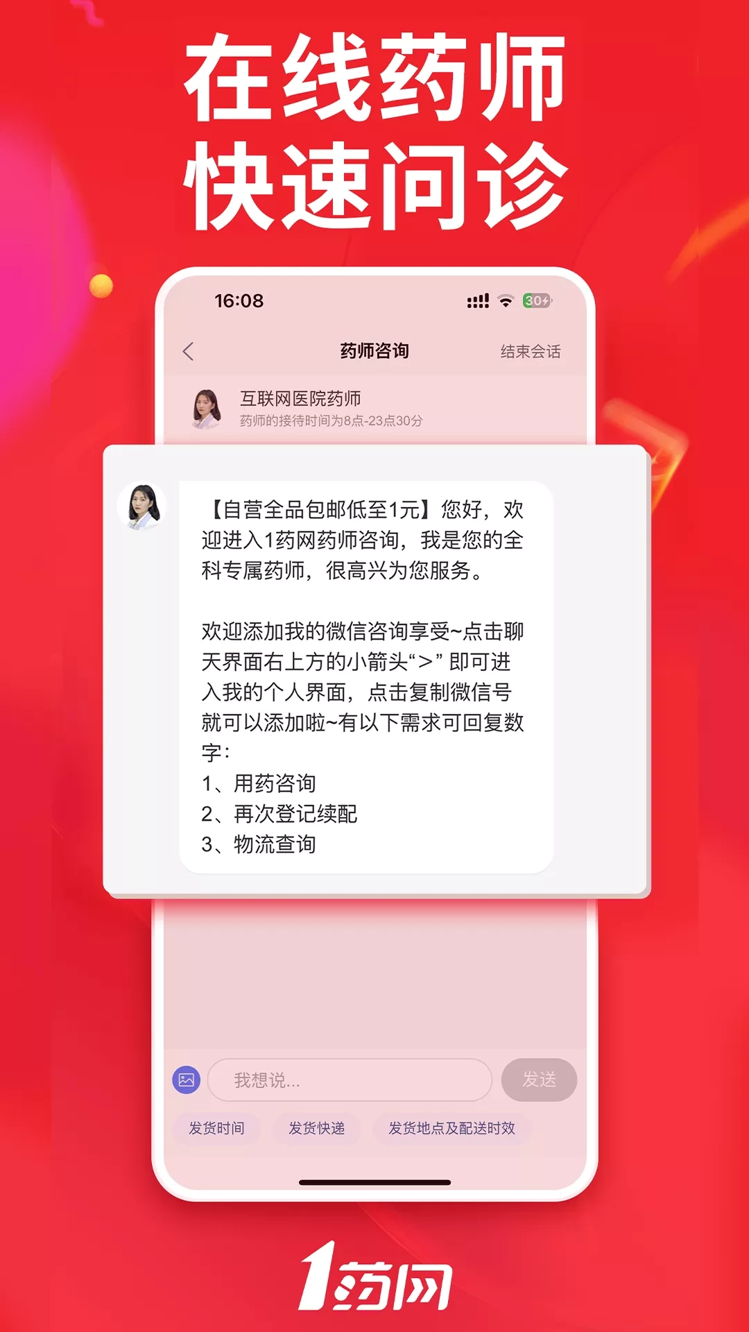 1药网,专业的网上购药平台,其前身是:1号药店、壹药网。 【1药网,专业的网上购药平台】 就医流程:筛选好医院、选择好医生、预约、挂号、购药、送药、用药......,1药网将与药房网、康爱多、平安好医生、微医、叮当快药、春雨医生、爱康国宾、丁香医生、医指通、健康160快方送药、趣医院等APP一道建立良好的患者就医、购药、用药体验; 【1药网,专业的网上购药平台】 为客户提供健康减肥、整容备孕、孕期睡眠、打折买药、全球购物等服务; 【1药网,专业的网上购药平台】 1、正品保证:首家“正品联盟”,超过500家知名医药健康产品厂商源头采购,品质保证。 2、商品超过140,000种,涵盖中药、西药、成人用品、本草纲目、维生素钙、滋补保健、隐形眼镜等。 3、优惠满满:便宜买好药,多形式的优惠让利,每月会员专享,始终为您准备惊喜。 4、专业服务:每天9:00~21:00专业用药在线咨询服务,帮您选对药、用对药。 5、名医在线:卫计委批准的互联网医院项目,三甲名医提供电话、视频问诊及电子处方。 6、闪电配送:当天下单,当天出库;北京、上海、广州等重点城市次日达。 7、快捷体验:快速找药、便捷支付,支持银联、支付宝、微信、货到付款等。 8、隐私保护:所有药品严格打包,杜绝泄露药品信息。