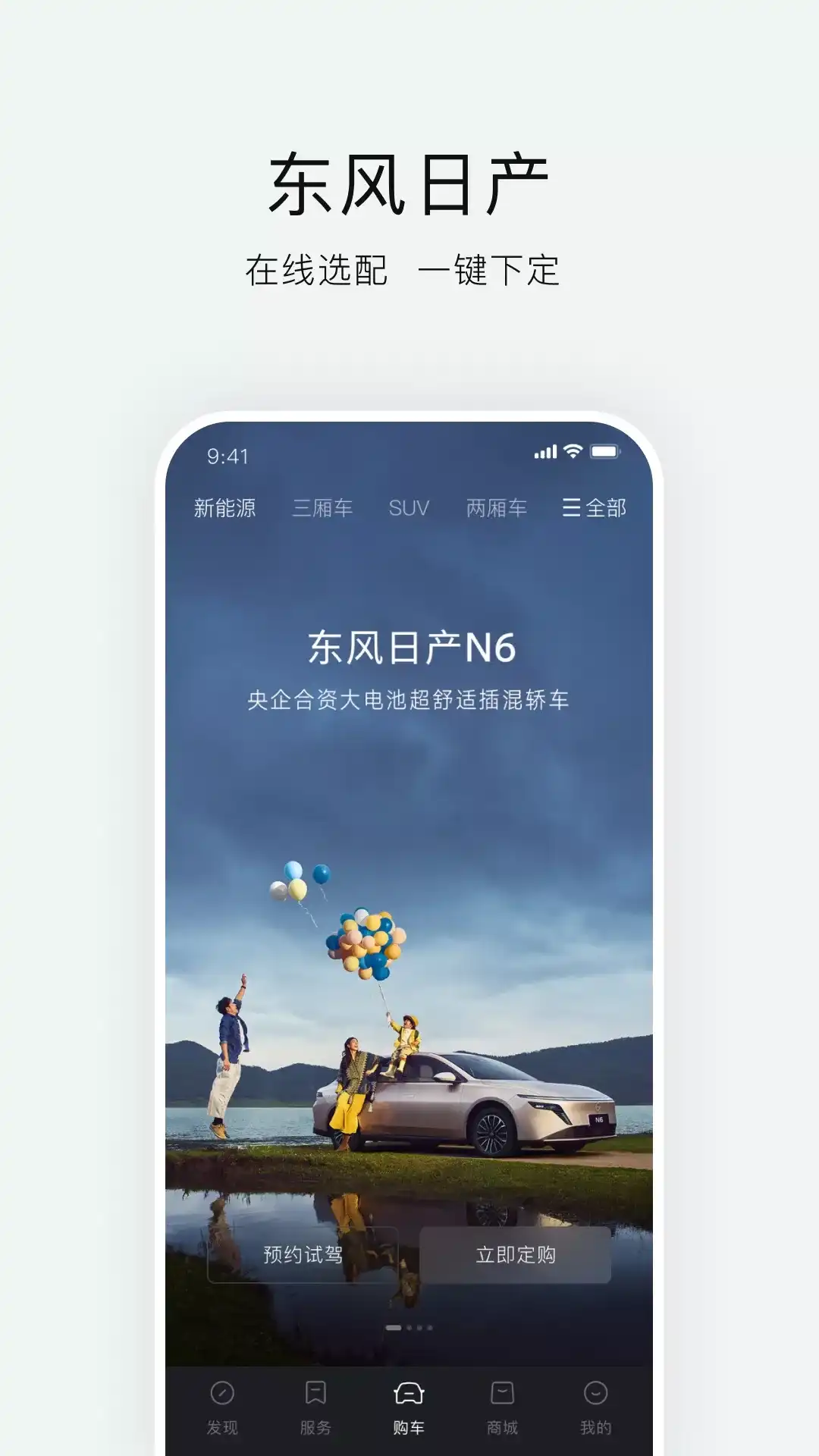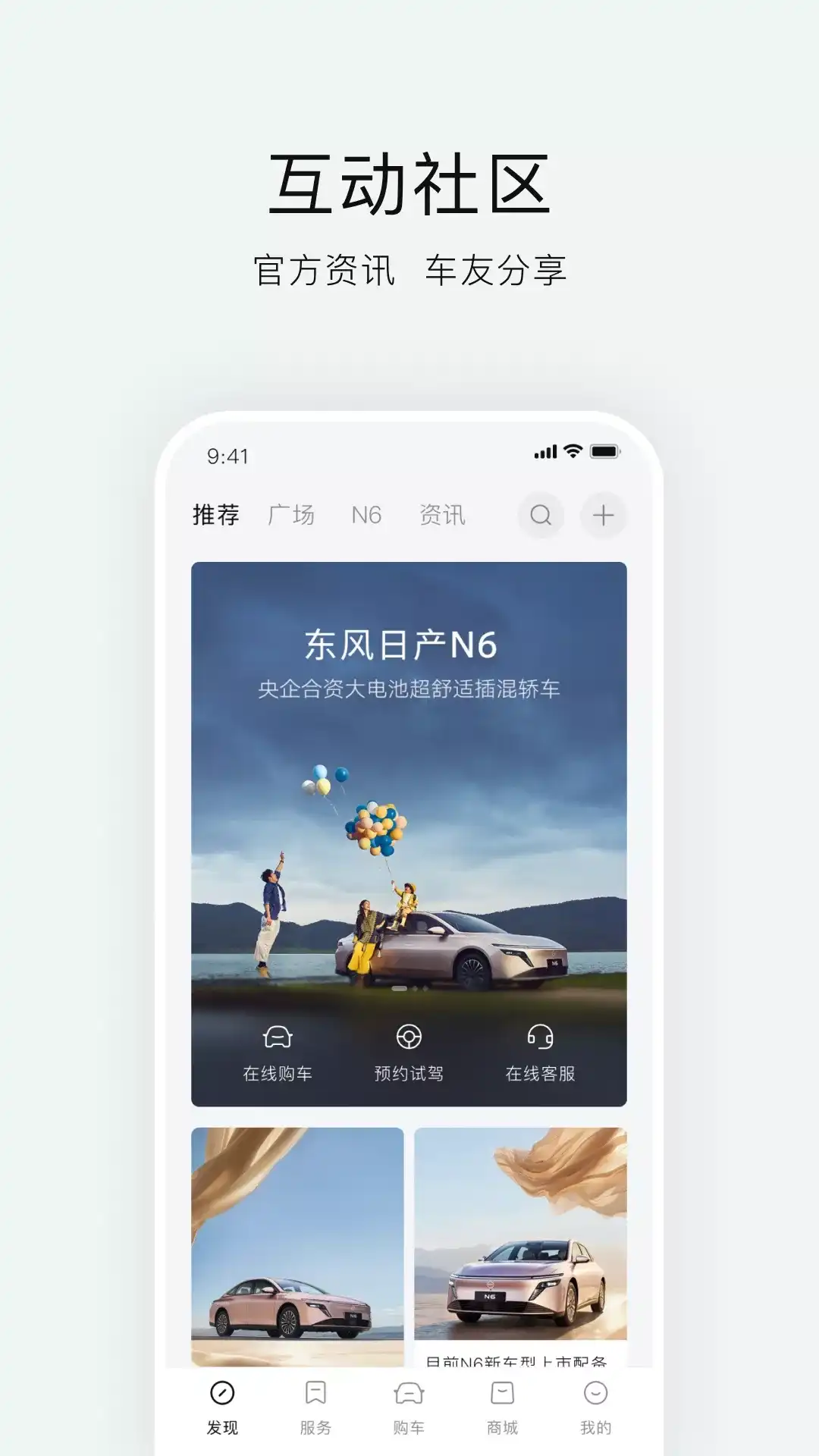 购车∣东风日产各款汽车核心亮点和技术参数介绍,可预约试驾,在线选配一键定购您的东风日产汽车。 社区∣了解东风日产汽车品牌资讯,交流用车体验,分享精彩人车生活。 商城∣可选购原厂正品附件,以及丰富的生活精品,支持积分兑换和直接购买,体验更美好的人车生活。 车控∣绑定激活车辆后,实时安防,查看车辆状态,并可远程控制您的车辆。 服务∣整合各类用车服务栏目,丰富的服务工具助你用车无忧。 因车型及版本配置不同,本APP提供的功能有所区别,请以实际显示为准 更多详情,请访问东风日产官方网站:www.dongfeng-nissan.com