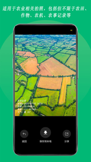 农用相机,这是一款用图片记录农业相关操作的应用,免费的水印拍照相机,设定水印、一键拍照,时间、位置信息自动生成,定位精准,防篡改。 【水印模板丰富】事项记录、时间、地点、经纬度、天气等;水印上内容选项自由开关,可自由设置其水印展示。 【时间、定位精准】北京时间显示,精准锁定当前位置,真实记录工作与生活,时间、定位实时自动更新,无需其他赘余操作。 【适用场景广泛】适用于农业相关拍照,包括但不限于农田、作物、农机、农事记录等,适用于农业巡查、勘察取证、外勤拍照、工程管理等;拍照片,防篡改,好用的拍照APP,农业工作者共同的选择。 【一键分享】轻松拍照,水印照片自动生成,随时随地将照片进行分享:微信好友、微信群、朋友圈;方便快捷,工作生活两不误。