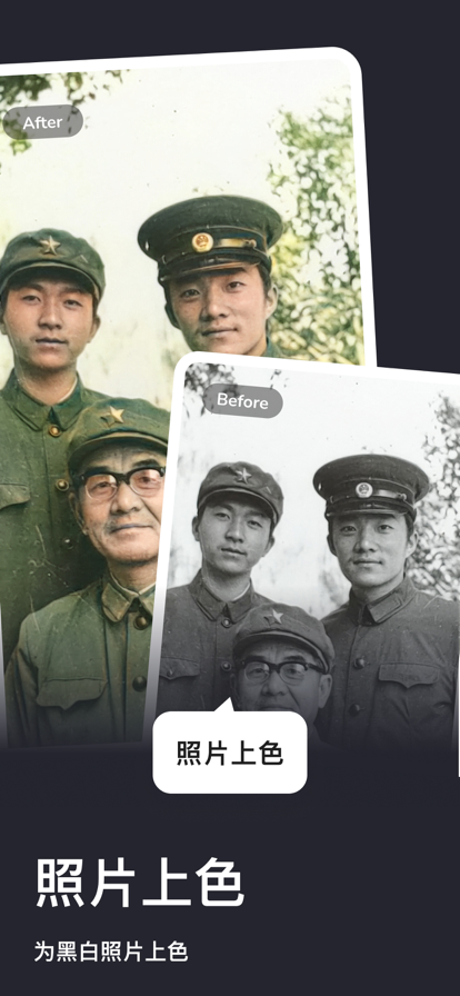 照片翻新 APP,让照片绽放新光彩 你是否曾为老照片的折痕、模糊而叹息?是否渴望为黑白照片添上鲜活色彩?又或者想将平凡照片变成艺术佳作?这款照片翻新 APP,满足你的作图需求! 强大功能,满足多元需求: -精修照片,雕琢每处细节 运用先进 AI 算法,精准优化照片画质,提升色彩饱和度、对比度,锐化边缘,让照片质感飞升。无论是风景照、人像照,都能细腻呈现,展现独特魅力。 -拯救废片,变腐朽为神奇 模糊不清、曝光过度、色彩失真…… 这些都不是问题!APP 智能识别并修复照片瑕疵,还原清晰画面,让那些被遗忘的废片重获新生,成为珍贵回忆的完美记录。 -画质增强,高清视觉盛宴 突破分辨率限制,无损放大照片,自动填充细节,使画面更加清晰、细腻。从低像素老照片到网络下载的模糊图片,都能一键升级为高清大片,带来震撼视觉体验。 -折痕照片修复,抚平岁月痕迹 独特算法精准定位折痕,智能填补缺失像素,去除褶皱,让老照片重现平整光洁。仿佛时光倒流,将岁月留下的痕迹悄然抹去,唤醒尘封记忆。 -擦除路人,聚焦精彩瞬间 只需轻松涂抹,即可快速擦除照片中闯入的路人或多余物体,智能填充背景,保持画面自然流畅。从此,照片只留存你想要的主角与美好,构图更完美。 -照片上色,点亮黑白世界 为黑白老照片注入鲜活色彩,基于海量数据训练的 AI 模型,能根据场景、人物精准匹配色彩,还原真实生动的色彩场景,让历史瞬间跃然眼前,鲜活起来。 -图片变漫画,开启创意之旅 多种漫画风格任你选择,一键将照片转换为个性漫画,无论是 Q 萌可爱风,还是炫酷热血风,都能轻松实现,为你的照片增添别样艺术气息,满足创意表达。 -一句话改图,所想即所得 强大的自然语言处理技术,只需输入你的修改需求,如 “把天空换成蓝天白云”“给人物添加微笑”,我们便能理解并精准执行,轻松实现照片随心改,创作无边界。 快来下载照片翻新 APP,开启照片翻新之旅,让每一张照片都成为值得珍藏的艺术品,记录生活的精彩瞬间! ------------------------------- 订阅说明以及条款 【订阅价格】 1、 周会员-¥18 2、月会员-¥38 3、年会员-¥88 隐私政策:http://static.rhinox.cn/html/privacy/10165189133779517290.html?appName=照片翻新 付费协议:https://static.rhinox.cn/html/paymentagreement/general.html