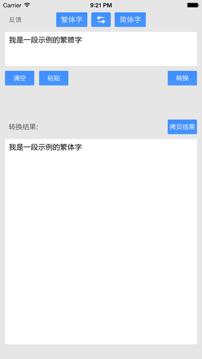 功能简介: ° 快速准确的繁简转换 ° 包括多种翻译模式,内涵香港繁体,台湾正体,大陆简体,常用词汇翻译。 ° 可把转换後的内容复制到剪贴簿,方便用户使用 ° 下载之后无需联网即可使用!