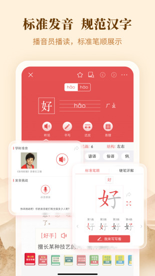 《新华字典》App,商务印书馆权威出品,中国社会科学院语言研究所编修。新增"工具书云平台"模式,收录27部权威字词典,为用户打造一站式学习助手。 ◆权威辞书知识◆ • 新中国首部现代汉语字典,汉语辞书典范之作 • 荣获第四届国家图书奖荣誉奖、第三届国家辞书奖特别奖、第三届出版政府奖图书奖提名奖 • 获“最受欢迎的字典”和“最畅销的书(定期修订)”两项吉尼斯世界纪录 • 入围数字出版精品遴选推荐计划,累计下载量超1亿次 ◆全能学习宝库◆ 【基础夯实】完整收录《新华字典》,同步纸质书更新 【拓展升级】融合《现代汉语词典》《古汉语词典》等共27部工具书 【发音规范】新闻主播标准读音,支持跟读对比练习 【书写指导】动态+静态笔顺演示,屏幕临摹更直观 【专项突破】多音字精讲+易错字汇编,扫清语文学习雷区 ◆趣味学习法宝◆ 【汉字探秘】从甲骨文到简体字,动态展示汉字千年演变 【诗词天地】精选小学初中必背古诗,配套赏析注解 【闯关游戏】字词接龙/成语挑战/古汉语挑战,边玩边学 【每日打卡】易错字提醒+组词接龙+成语解密,5分钟轻松积累