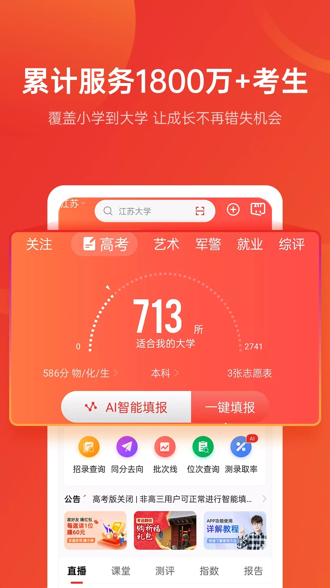 优志愿专注于为广大考生提供多元升学规划服务。覆盖全国30省市,提供在线高考志愿填报、美术志愿填报、军警校、强基计划、综合评价、高职单招、考研等全方位服务。迄今为止,优志愿已累计服务1600万+考生,帮助他们成功实现升学梦想,成为考生和家长们都信赖的教育APP。 初高中提分、高考选科、高考志愿填报工具 高考提分看优志愿讲堂,初中、高中名师同步课堂,知识点划分清晰,哪里不懂学哪里,快速提分。 高考报名咨询、高招动态、招生章程一站式获取 新高考选科,优志愿三步走科学规划高中选科问题 全面适配全国30个省份高考报考规则,一键快速匹配适合的志愿方案。 招生计划分数线查询、志愿填报、模拟填志愿 学长学姐们都在用的高考志愿填报功能 优志愿,与官方公布数据保持一致的志愿填报平台,包含2800多所院校近8年院校、专业录取、招生计划数据。根据院校历8年录取分数线、位次和当年招生计划等数据,结合目标专业、高考成绩,运用6大核心算法推荐录取率高的院校。