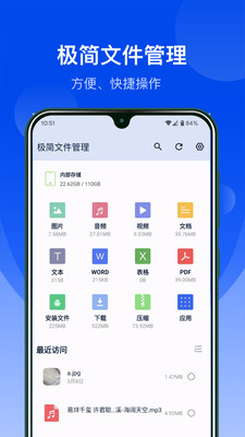 极简文件管理是一款全面、方便、快捷的文件管理应用,可以帮助您快速管理手机里的各种文件(word、excel、pdf、图片、视频等)。 1、首页直观管理各种不同文件类型,快速定位文件; 2、高效的文件预览(音视频文件快捷播放); 3、已安装应用详细展示,并进行管理。