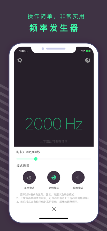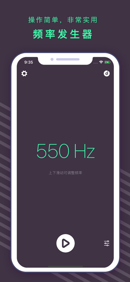 本应用能轻松的制作出不同频率的声音,操作简单,非常实用,手指上下滑动可自由调整频率。应用内,还内置了白噪音,让您与大自然零距离接触,非常适合睡眠不好,时常容易分心,或者是长期有焦虑不安情绪的人群。 特点: # 可以自动调节频率; # 频率最高可调整到25000Hz; # 内置多种白噪音,让您与大自然零距离接触; # 支持列表循环、单曲循环、随机播放和顺序播放等模式; # 已全面适配iOS13。 隐私政策和用户协议: https://zhuanlan.zhihu.com/p/83542874