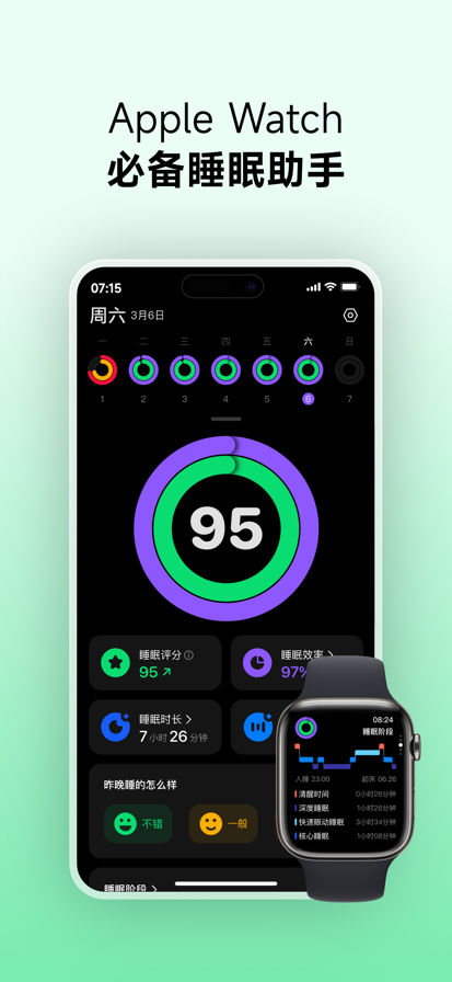 使用手表来自动追踪您的睡眠*。无需按动任何按钮,无需安装任何手表应用,只要安稳睡觉就好! 关于 AutoSleep ----------------- 使用先进的启发式应用 AutoSleep 来计算您的睡眠时长。 如果您戴上手表睡觉,您什么都不需要做。AutoSleep 会自动监控您的睡眠时长与质量并在您早晨第一次解锁手机后给你发送通知。 即使您不带着手表睡觉, AutoSleep 也可以计算您在床上的时间。这非常简单。 因为人总是各异的,AutoSleep 提供了微调选项,您可以通过简单地滑动滑块来调整自己的睡眠活跃度检测级别并可以很快速地看到睡眠时钟的统计变化。它还允许您自定义睡眠窗口, 是否需要每日通知以及在睡眠时钟上显示更多或更少的信息。 与 Apple 睡眠阶段应用完全集成,使您可以选择使用 Apple 睡眠应用并在 AutoSleep 中查看所有信息。 AutoSleep 包括睡眠监控所需的所有信息和功能,包括: 睡眠时间 – 睡眠时长和睡眠银行余额 睡眠评分 – 对您睡眠的综合评分 睡眠环 – 用高质量的睡眠填充您的睡眠环,包括心率、深度睡眠和快速动眼 Apple 睡眠阶段 – 可使用 Apple 睡眠应用中数据的选项 睡眠呼吸暂停 - 了解您是否患有睡眠呼吸暂停 睡眠血氧 – 睡眠时的测量值 呼吸频率 – 记录您每分钟的呼吸 噪声 – 环境噪声测量值 睡眠分析 – 查看您的睡眠周期的详细图表和细分情况 睡眠燃料 – 衡量您的睡眠质量和效率 今晚就寝时间 – 根据您的习惯推荐您最近的就寝时间 就绪 – 表示您的身体和精神压力 温度 – 跟踪您睡眠时的手腕温度 睡眠一致性 – 了解您的就寝时间习惯 熄灯 – 跟踪入睡时间 实时睡眠跟踪 – 查看您夜间的睡眠统计信息 智能闹钟 – Watch 内置的智能闹钟,帮助您从较浅的睡眠中醒来 小组件 – 各种各样超棒的 iPhone 小组件 复杂功能 – 多种 Watch 表盘选项 HomeKit – 与 Apple HomeKit 完全集成 表情符号和笔记 – 记录对睡眠时段的评论和标签 探索 – 深入分析视图 Siri – 通过 Siri 语音指令使用 快捷方式 – 创建您自己用于 AutoSleep 的快捷方式 调整 – 调整您个人睡眠/醒来检测的简单功能 历史 – 高级图表和趋势 配置 – 更改主题并设计您的时钟睡眠环 设置 – 定制您的睡眠目标、设置通知和提醒 导出 – 导出选项以保存数据 AutoSleep 可以与 HeartWatch 联动,它是我们首推的心跳与活动检测应用。AutoSleep 会将您的睡眠信息记入健康应用中。 *需要运行 Watch OS 4 或更高版本的 Apple Watch。 - 2018年度最佳 https://apps.apple.com/story/id1438574124/ - 2019年度最佳 https://apps.apple.com/story/id1484100916/ - 2020年度最佳 https://apps.apple.com/story/id1535572713/ - 2021年度最佳 https://apps.apple.com/story/id1591083005/ - 2022年度最佳 https://apps.apple.com/story/id1654240446 - 2023年度最佳 https://apps.apple.com/story/id1719170110