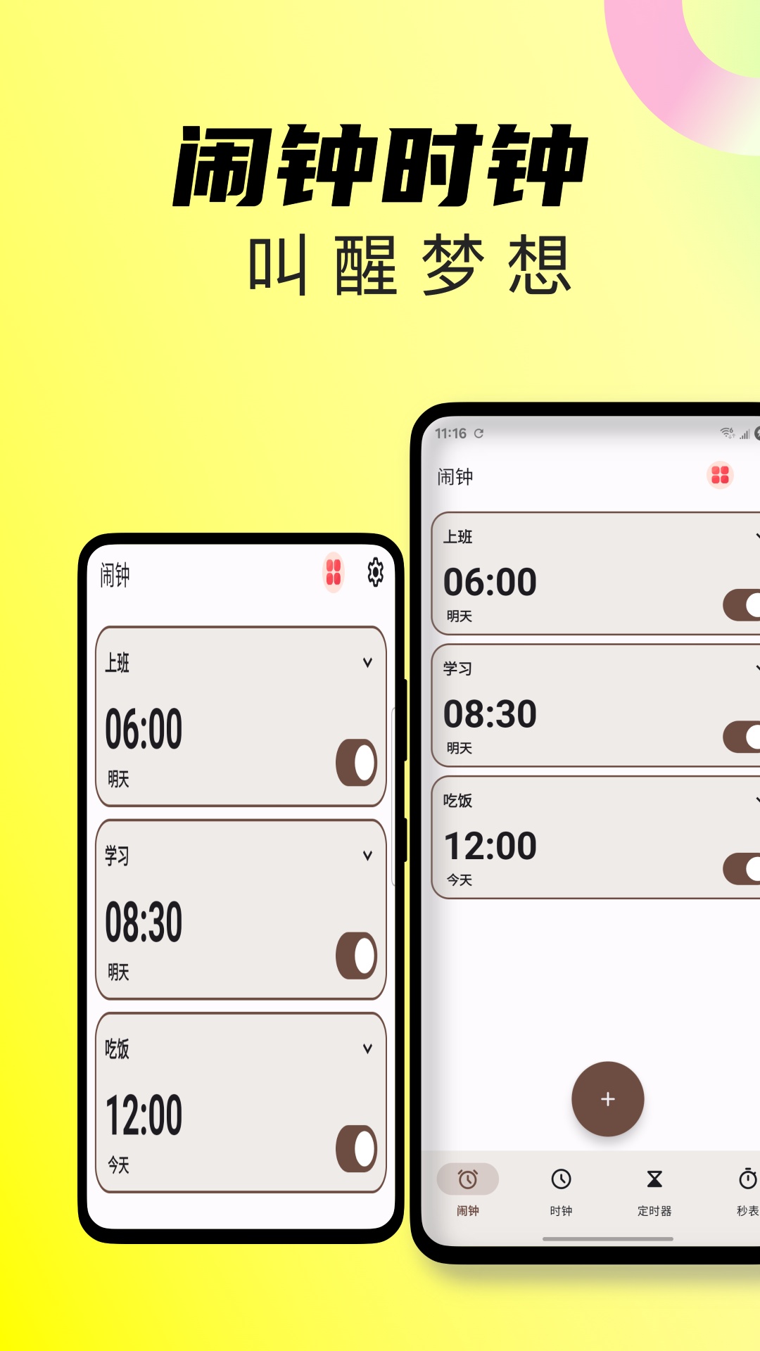 准时叫醒您的梦想,一款高效管理生活的应用。操作简单便捷,内含了便捷倒计时、闹钟主题等功能。在保持简约清新界面的同时,拥有更多趣味性体验,有效地保证了流畅的操作体验,更高效的科学化管理时间。<br>【定时器】<br>多种场景,举例,煲汤、跑步、午睡等事件,可自定义计时时间,一键保存,反复使用,不必每次重复设置,节省您宝贵的时间。<br>【闹钟】<br>闹钟唤醒周期、贪睡时间双重设置。闹钟铃声渐强提升,更贴心的闹钟,还您精致的睡眠。<br>【手电筒】<br>给你黑暗的夜晚照亮前路,更有SOS的闪光灯功能等。 <br>【世界时间】<br>世界时钟:显示世界时间,可以随意添加和删除,不需要联网也可,出差旅行必备。<br>【更多功能】<br>全屏时间、秒表等等更多功能等您解锁,给您生活带来极大的便利!