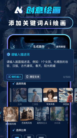 AI绘画是一款通过AI绘画技术进行艺术创作的智能画图软件。在这里你可以使用AI绘画技术,快速地将你创作灵感、文字描述,变为创意十足的艺术作品;也可以导入照片,转换成任何你想要的风格画作。AI绘画的功能强大,只有你想不到,没有我们做不到。 ——功能介绍—— 【AI创作】 -任意发挥想象力,输入画面主体,添加您想要的创作风格,一键生成画作,把天马行空的灵感变成无比真实的画卷 【AI素材】 -多种素材分类,壁纸、头像、插图、DIY物品自由创作 -精美素材实例图片,激发灵感,等你来看 【AI风格】 -古风、写实、二次元、机械感、印象派、电影质感等超多艺术风格 【AI作品】 -作品分类,帮你保存灵感,记录属于自己的创作 -一键应用,操作简单,轻松分享 更多精彩等你来发现! 联系我们:moreapps.service@gmail.com